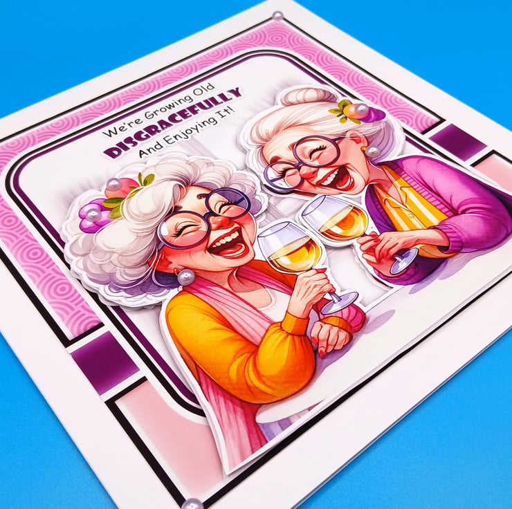 The main image is of 2 3D ladies sitting enjoying a glass of wine and having fun, the image has been decoupaged to give a 3d effect and I have added lilac pearl effect stones in each of the four corners and on the ladies ears and hair just to add an extra special touch to the card