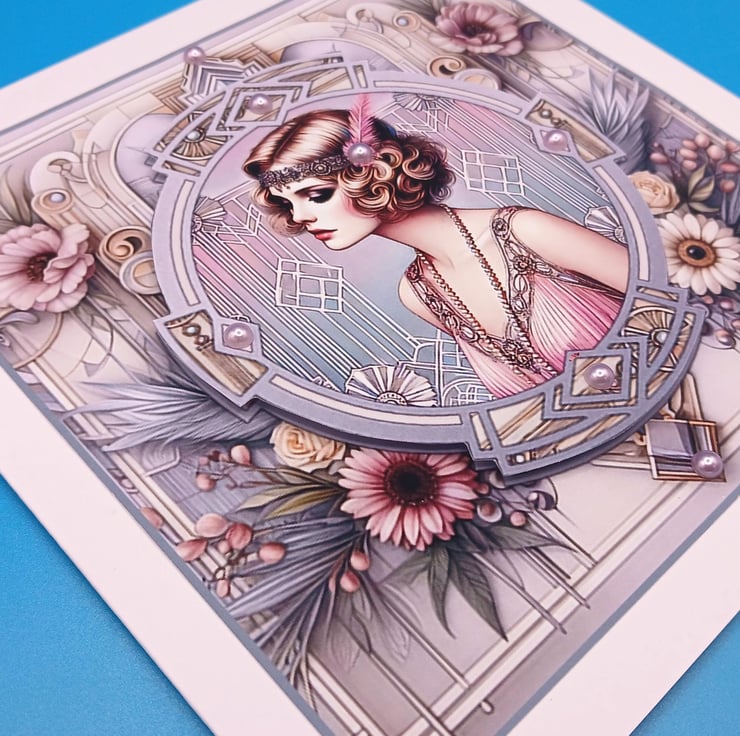 The main 3d image is of a lady dressed in art deco style clothes she has a head band with a flower and a lilac pearl effect acrylic bead