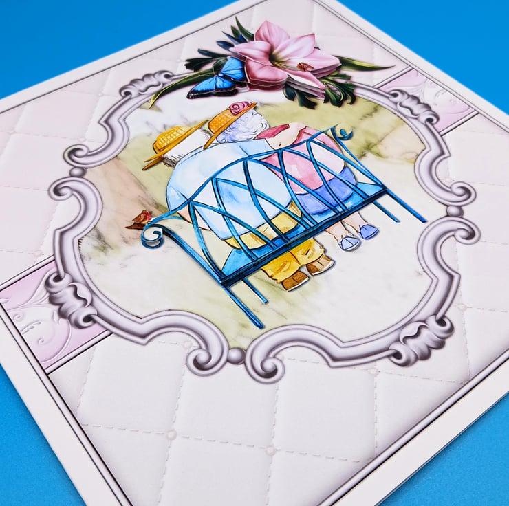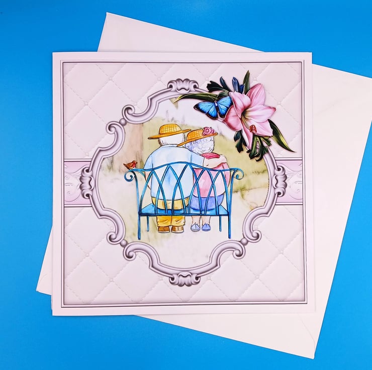 The back ground has a quilted design with the main image having an oval shape with a 3d image of an elderly couple sitting on a bench