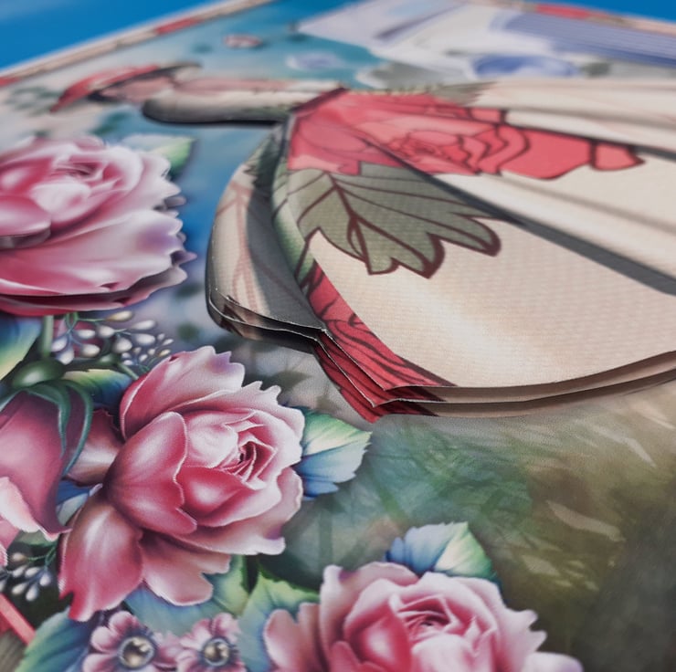 The main design is of a beautiful lady wearing a cream dress with a large pink rose and she is wearing a matching hat which have all been crafted using a 3d design