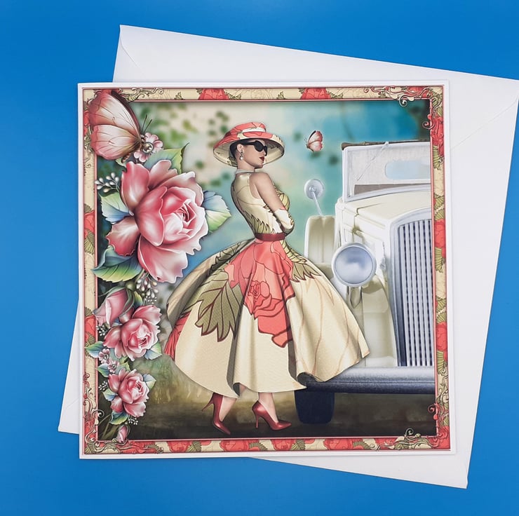 The background of the card is of a floral scene of pretty pink flowers and a 3d butterfly and a vintage car. round the edges of the card is a pink floral border