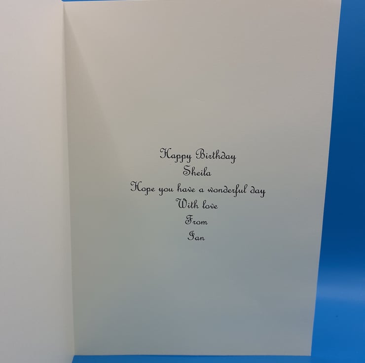 This white based Birthday card measures 8x8 inches 20x20cms and comes with a matching envelope and a insert that can be personalised with your own message please see the example of the insert in the pictures