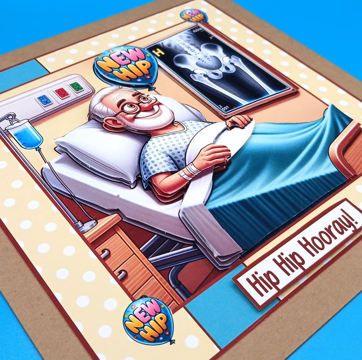 There is a gentleman sitting up in bed looking happyhe has a new hip this image has been decoupaged
