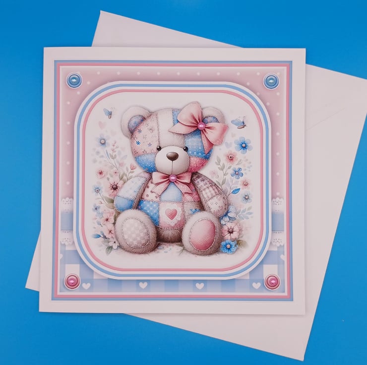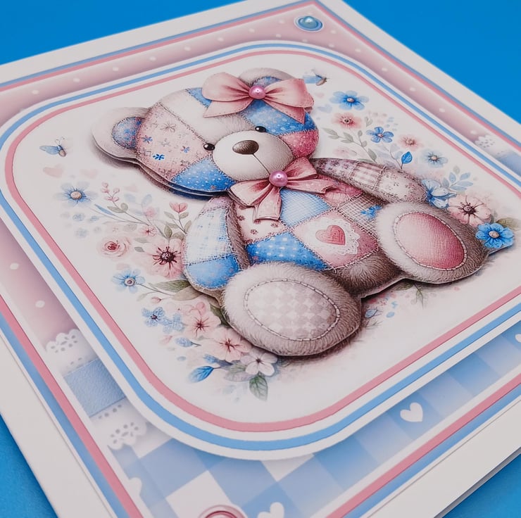 The main design is a wonderful colourful patchwork Teddy bear in shades of blue and pink it has been decoupaged to give a 3d effect, in the centre of the pink bows are pink pearl effect acrylic beads and I have added pink and blue pearl effect acrylic beads to the corners of the card