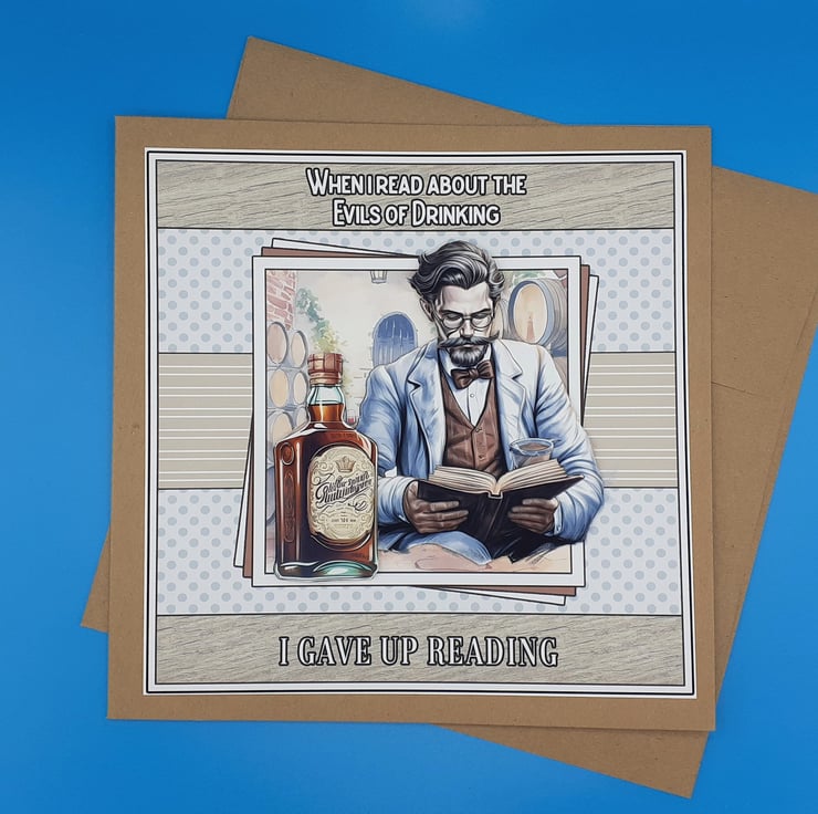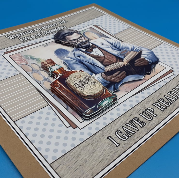 The greeting on the front of the card reads "when I read about the evils of drinking I gave up drinking"