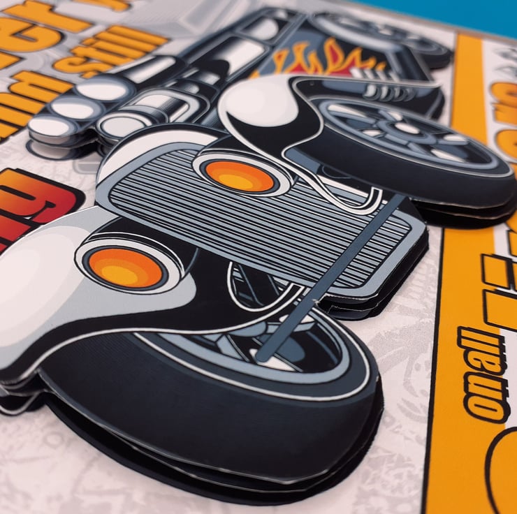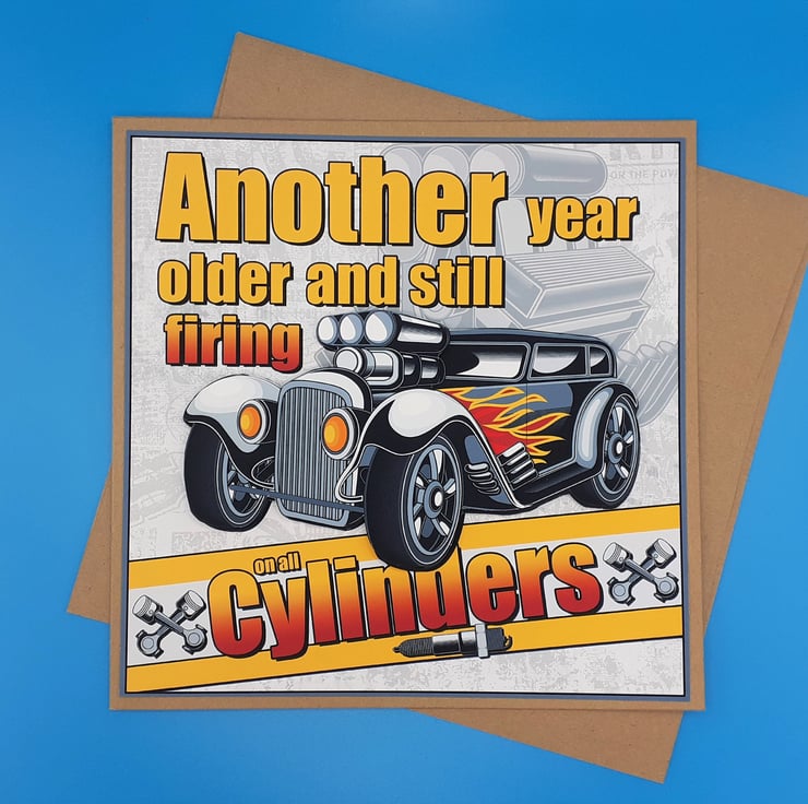 On the front of the card are the words 'Another year older and still firing on all cylinders'.