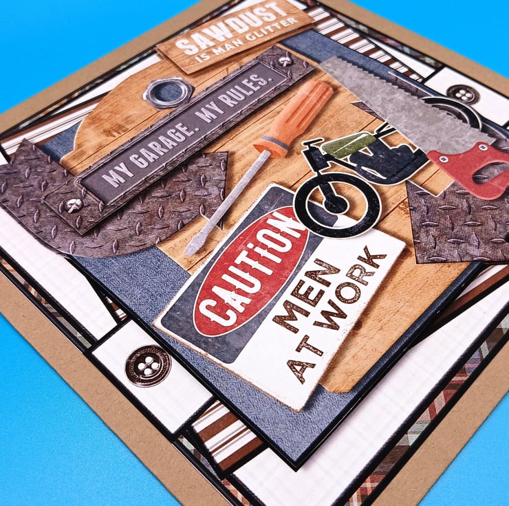 The design is of tools that are used by someone who does DIY and car and bike repairs the design has been decoupaged to give a 3d effect
