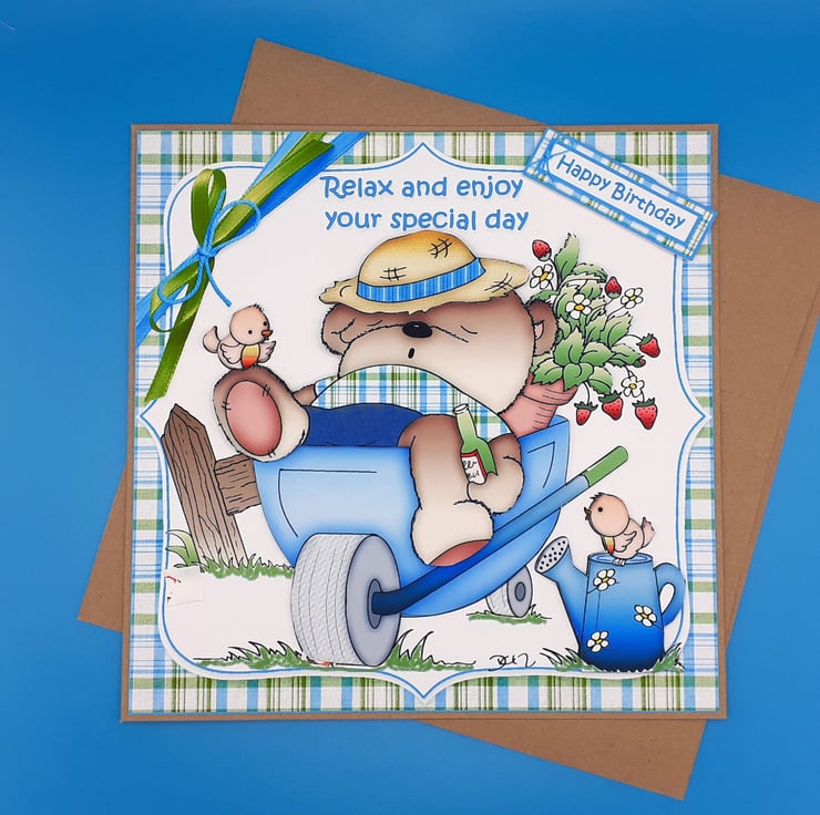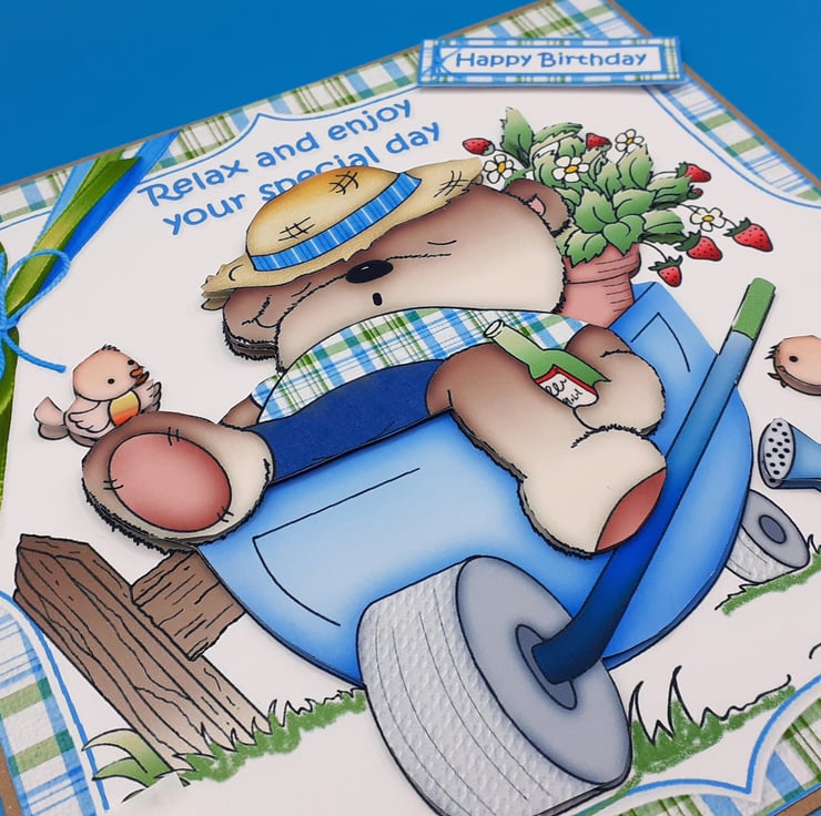 The main image of the card is of a large wheelbarrow that has strawberry and flower plants and sleeping in the wheelbarrow is a large Teddy bear wearing navy shorts and a checked shirt and a straw hat and he is holding a bottle of beer in his hand and the images have been decoupaged to give a 3d effect