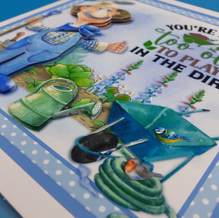 The words on the front read "You're never too old to play in the dirt" This is a great card for the gardener in your life.