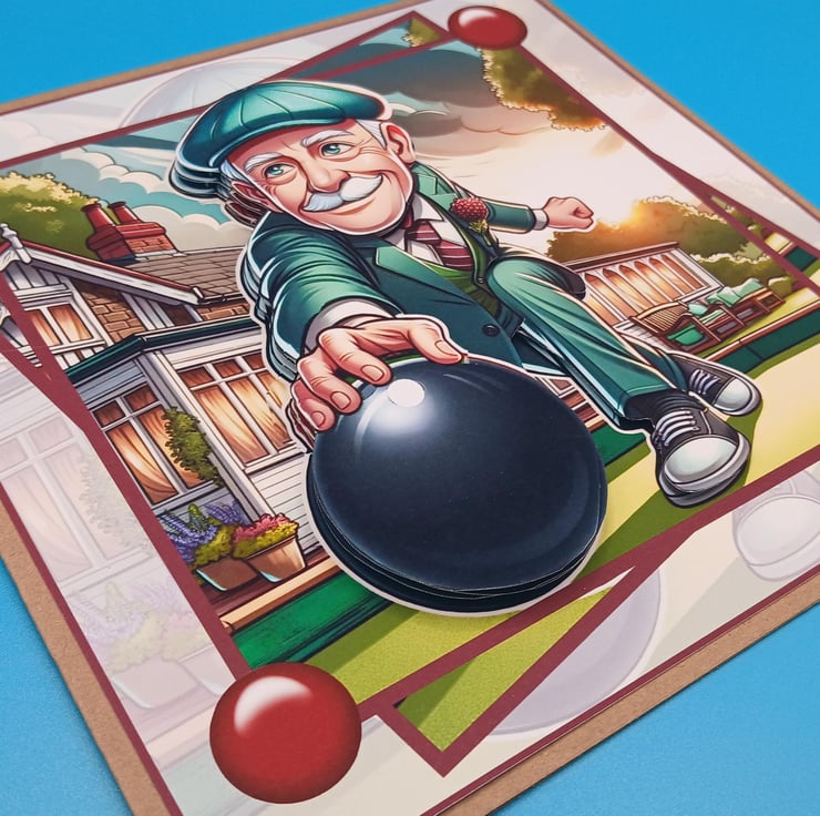 The main image is of a bowling green with gentleman playing bowls h has been decoupaged to give a 3d effect