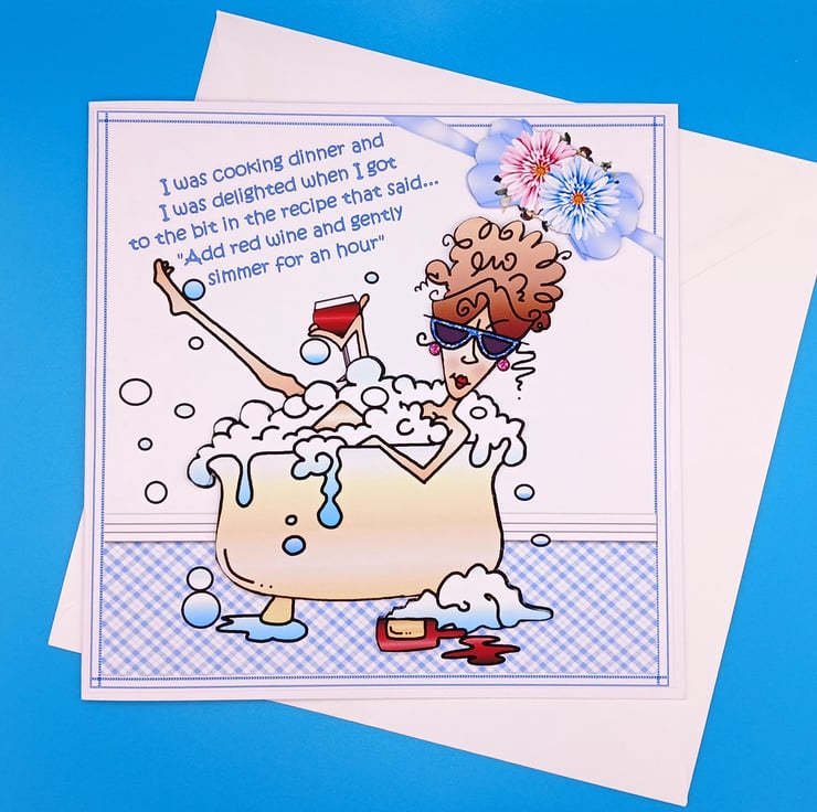 The greeting reads 'I was cooking dinner when I was delighted when I got excited when I got to the part that said add red wine and gently simmer for an hour"