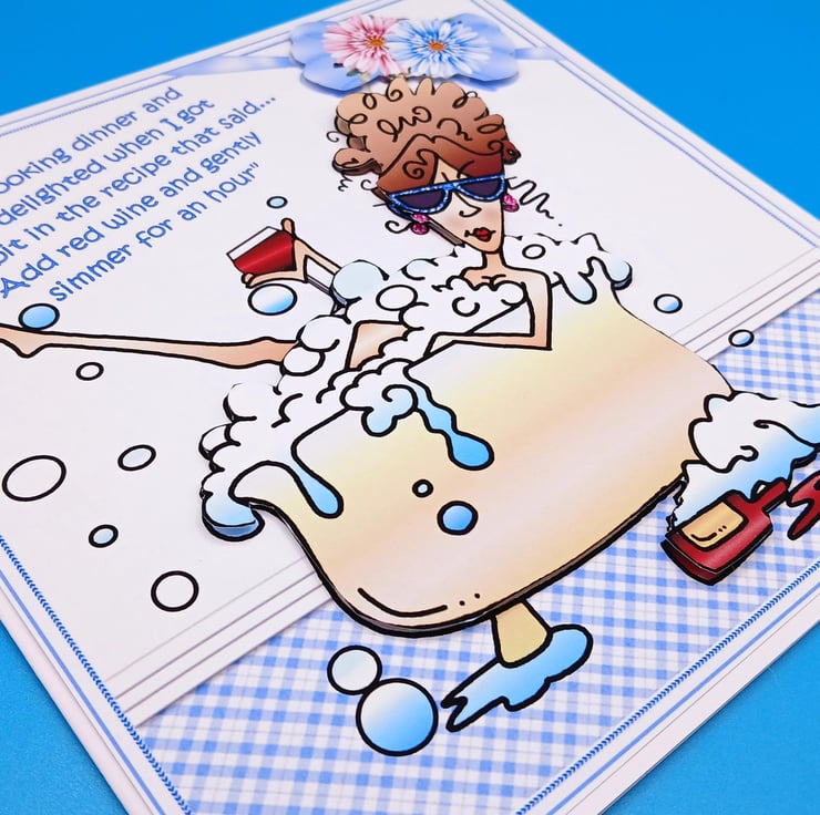 The main design of a lady in a bubble bath with a drink in hand which has been decoupaged to give a 3d effect