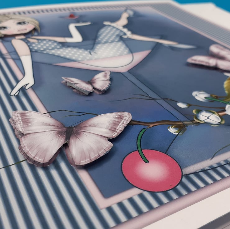 White base card with a main design of a lady in a large wine glass with 3d flowers and butterflies.