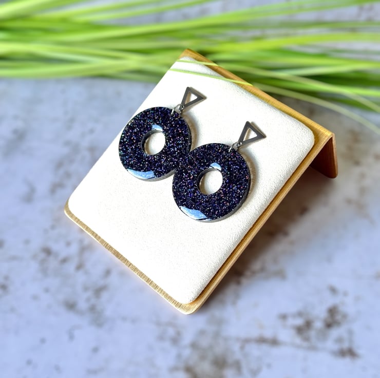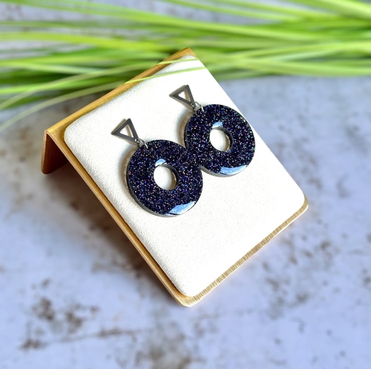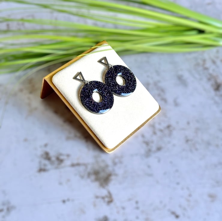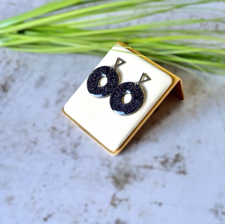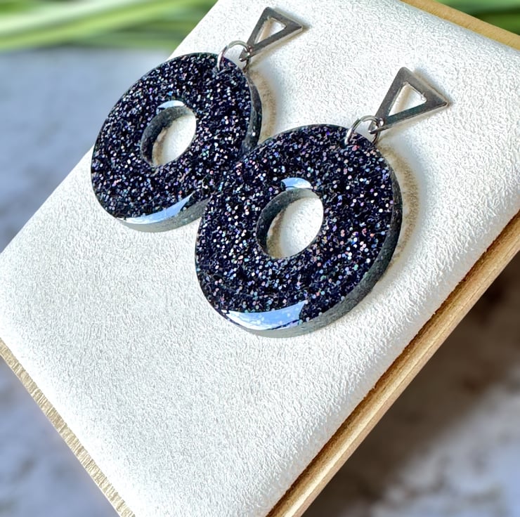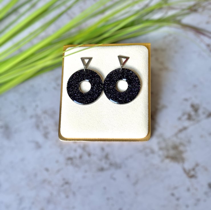 These black acrylic circle hoops are for the moments you want to feel powerful without saying a word. Sleek, bold, and endlessly wearable, the deep black finish is elevated by subtle encased glitter that catches the light just enough-like a little secret shimmer.