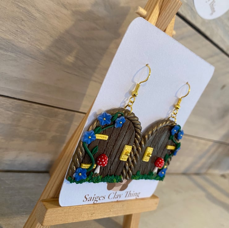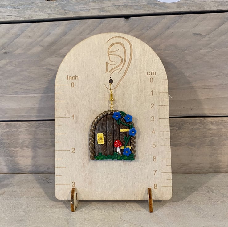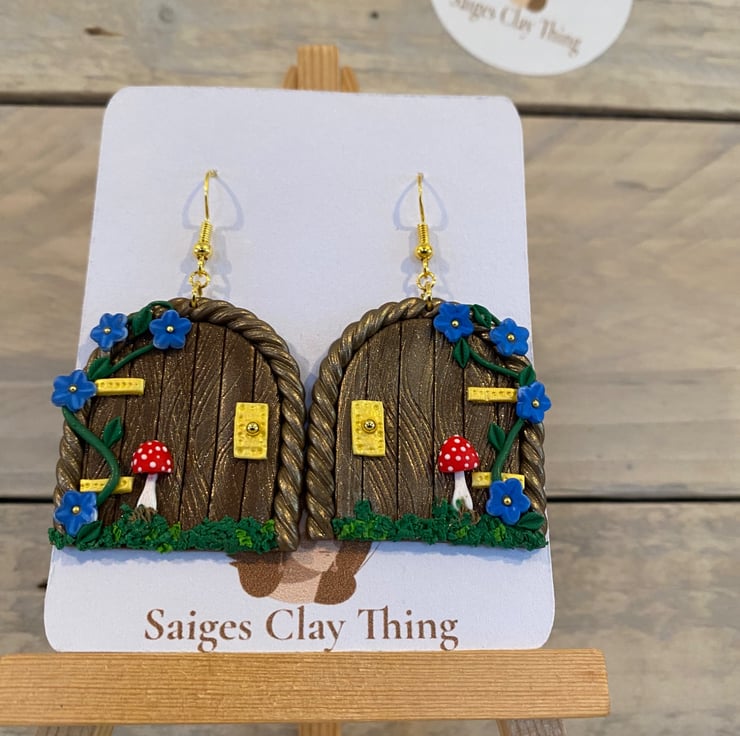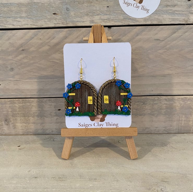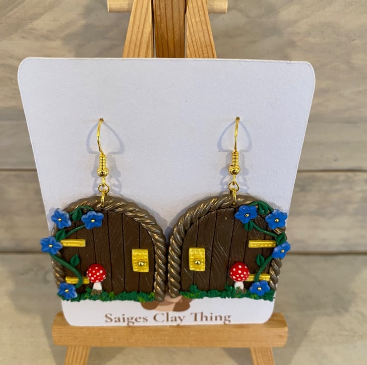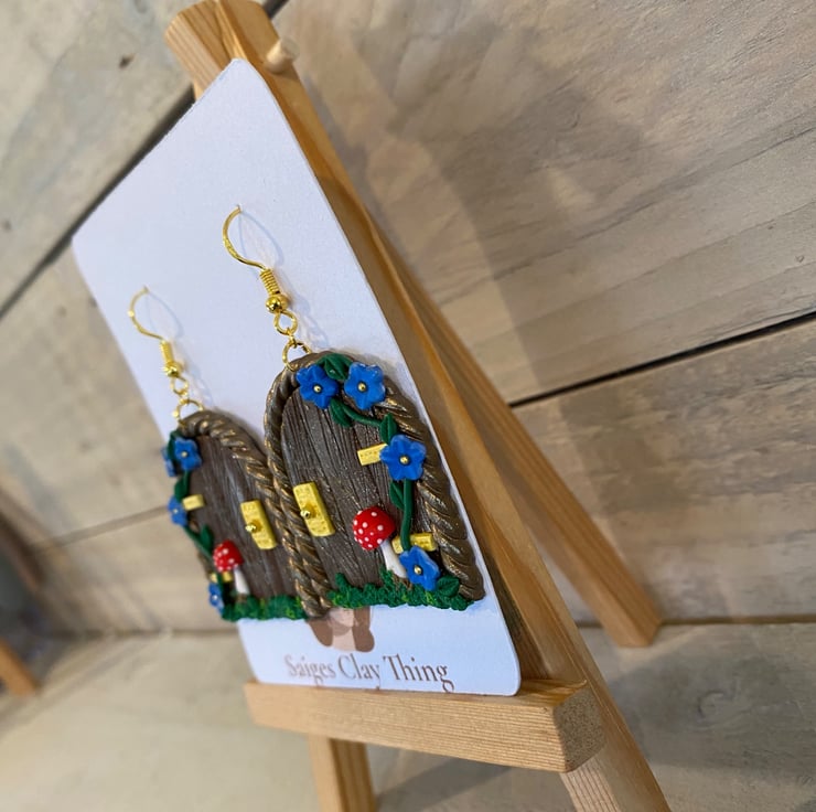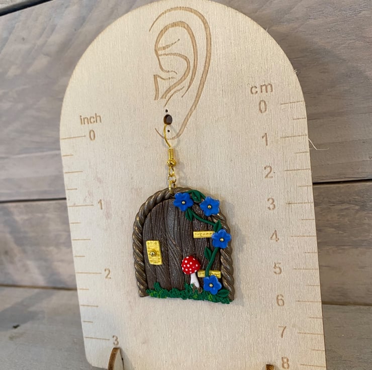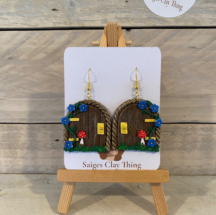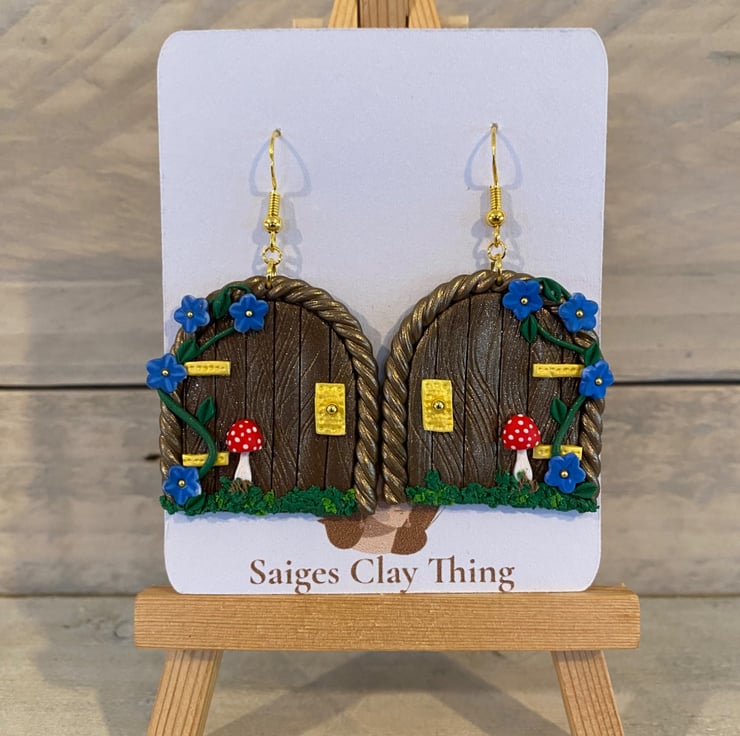 Step into a magical woodland world with these handmade fairy door earrings, featuring a miniature door design with delicate vines, tiny blue flowers, golden accents, and a charming red toadstool. Crafted from polymer clay, they're perfect for fairy lovers, cottage core styles, and anyone who loves a touch of everyday magic-ideal as a whimsical gift or standout statement piece.