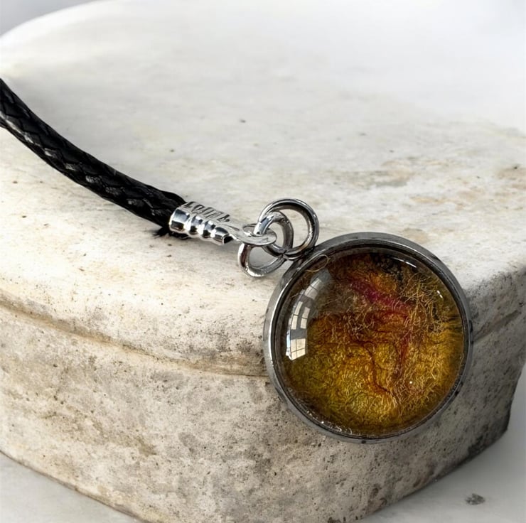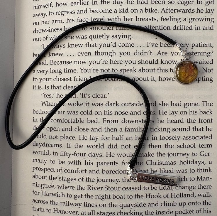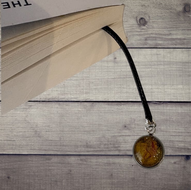 This beautifully handcrafted bookmark is designed for book lovers. It features a black cord which slips between the pages with two charms adorning the ends. One end features a silver tone metal charm engraved with the phrase 'I love books'. On the opposite end is a unique 12mm pendant charm housing a piece of handmade yellow felt overlaid with silk fibres set beneath a glass cabochon that enhances the colour and texture of the felt beneath.