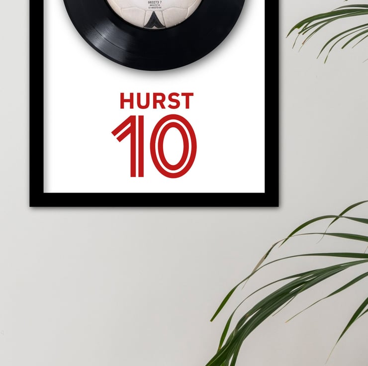 To celebrate its big anniversary and also 60 Years since winning the World Cup, this iconic UK Number 1 is now lovingly mounted and showcased in a professionally framed A4 display, complete with a glass front and a bold red vinyl cut graphic featuring the words 'HURST 10' commemorating Geoff Hurst's hatrick and winning goal in the 1966 World Cup.