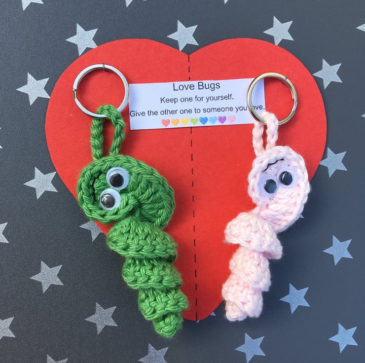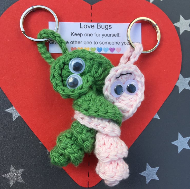 There are two little crochet bugs. They can be separate pieces, or twirled together to form one. They are the perfect friendship gift, or Valentines gift, or anniversary gift.