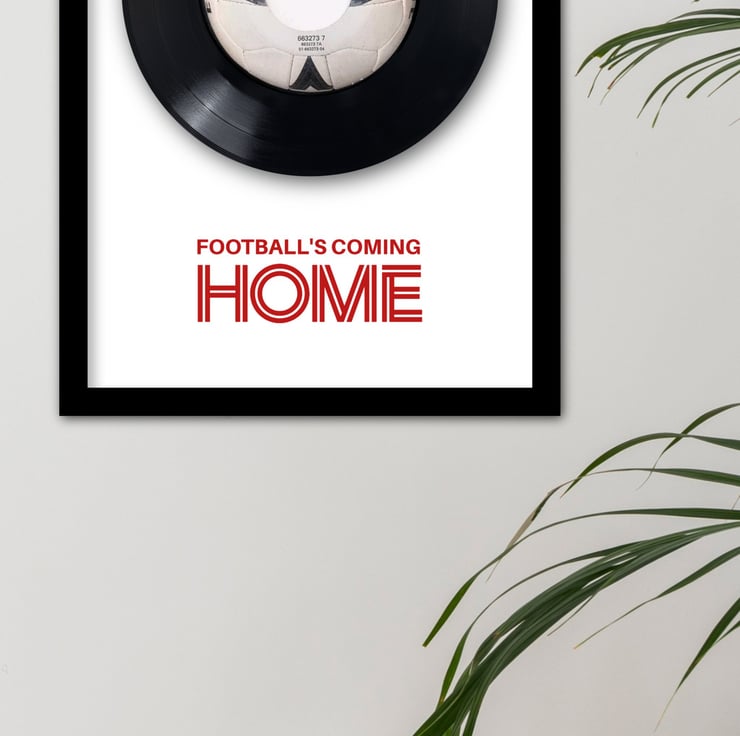 To celebrate its big anniversary, this iconic UK Number 1 is now lovingly mounted and showcased in a professionally framed A4 display, complete with a glass front and a bold red vinyl cut graphic featuring the the words 'FOOTBALL'S COMING HOME'.
