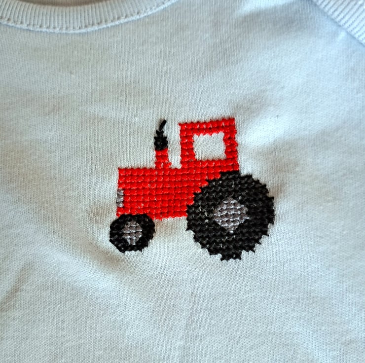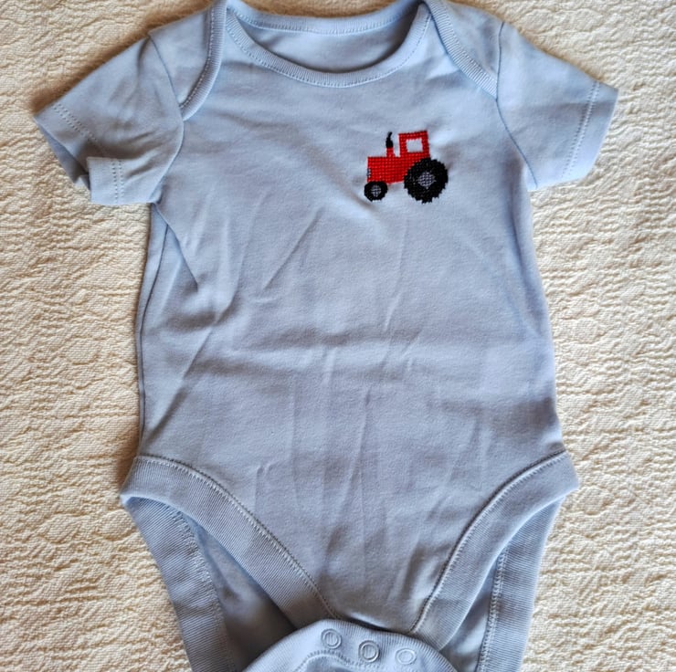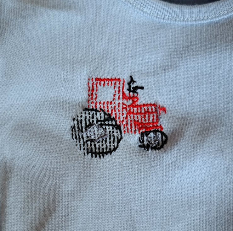I have hand-stitched a red tractor on the left front of this lovely light blue baby vest. As I never use a permanent backing when hand embroidering kids' clothing, there is nothing inside to irritate your child's skin. The vest has short sleeves, an envelope neck and three press studs between the leg openings. It is all cotton and can be machine washed.