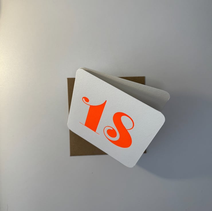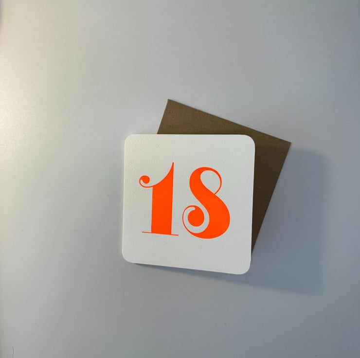 A hand printed 18th Birthday Card printed on an Arab Printing Press using wooden type and or printing blocks/polymers - Size circa 120mm by 120mm - printed on an eco-craft card - 300gsm paper with a manilla envelope - blank inside for your own personal message.