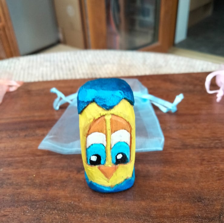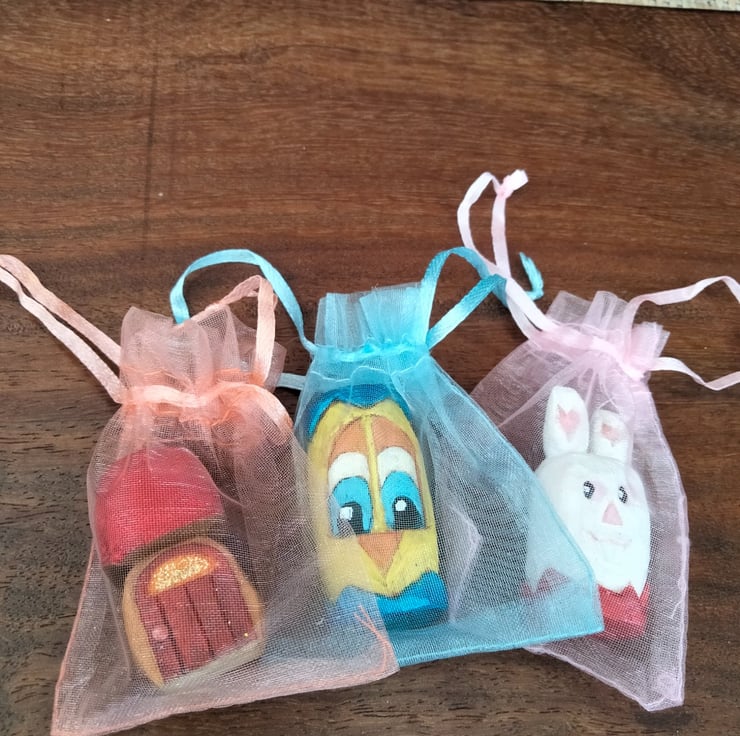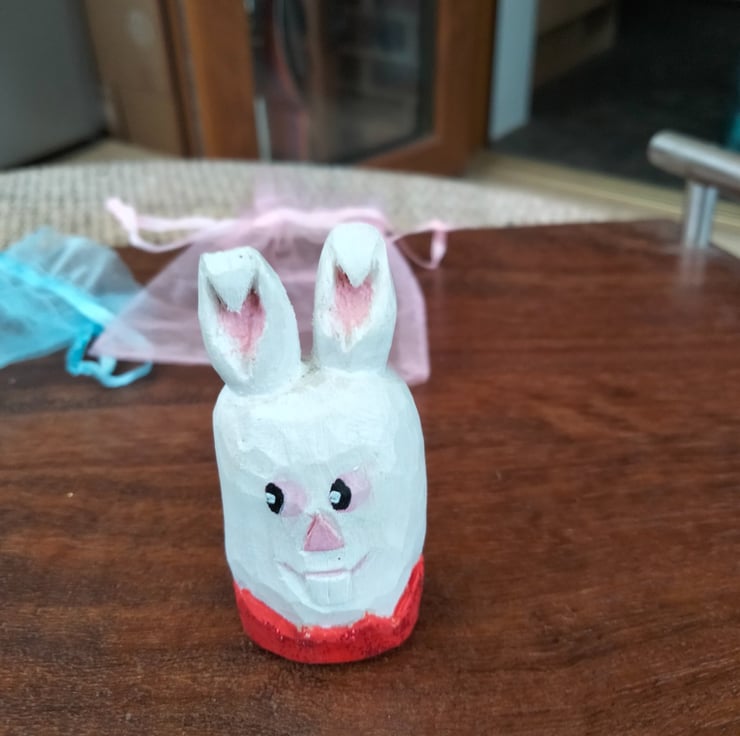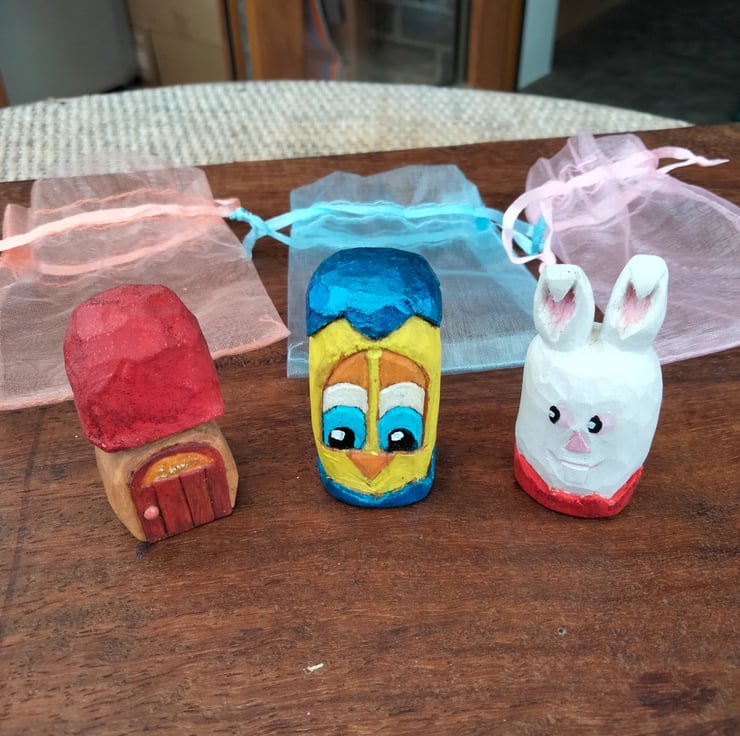 These Easter figures have been hand carved from either bassa wood or silver birch and stand at about 1.5"-2" high. They have been oiled and painted using acrylic paint. The colours may vary slightly from photos to real life. Any questions please ask.