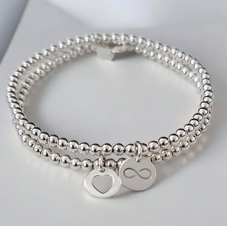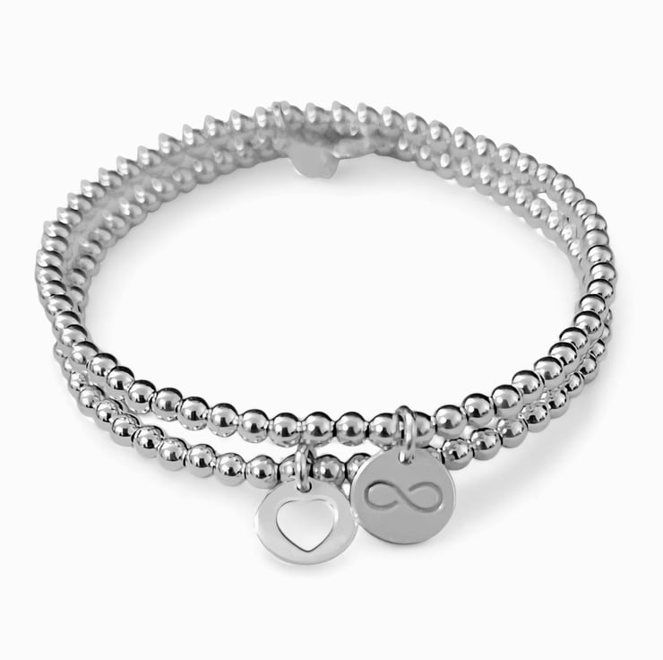 A perfect addition to any jewellery collection. A Stunning set of round cut out Heart and Infinity charm disc stretch stacking bracelets that has style and beautifully designed and crafted with top quality Sterling silver. These cute little bracelets make a perfect gift or treat for yourself. Perfect for wearing together or individually. This listing is for two bracelets, one Heart symbol bracelet and one Infinity symbol bracelet. Bracelets come complete with a signature Silversoul Collection Gift box & and Button Pouch.