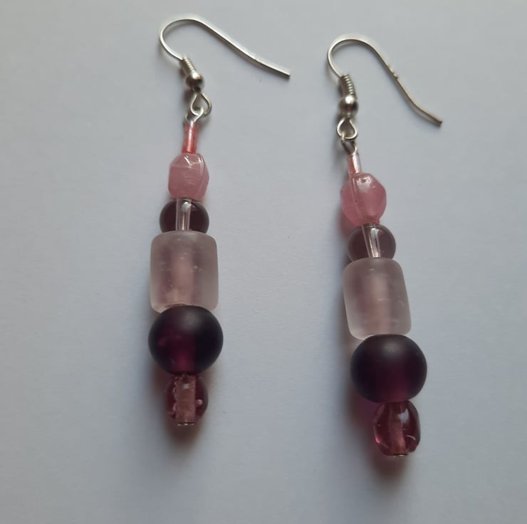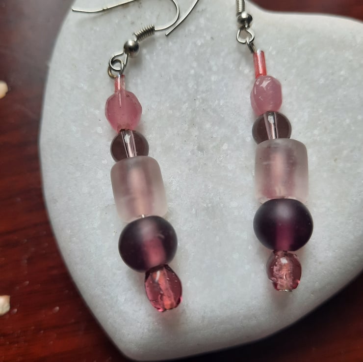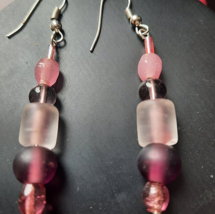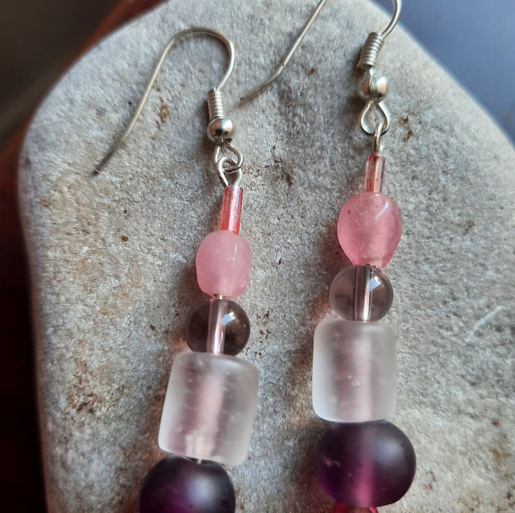 This set of earrings featured in this picture are beautifully put together by me. I was inspired by the pink and purple pebbles on the beach near by where I live, the glass beads have a velvety and smooth texture to the touch.