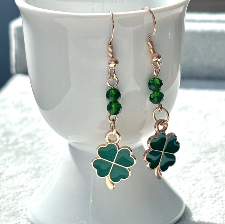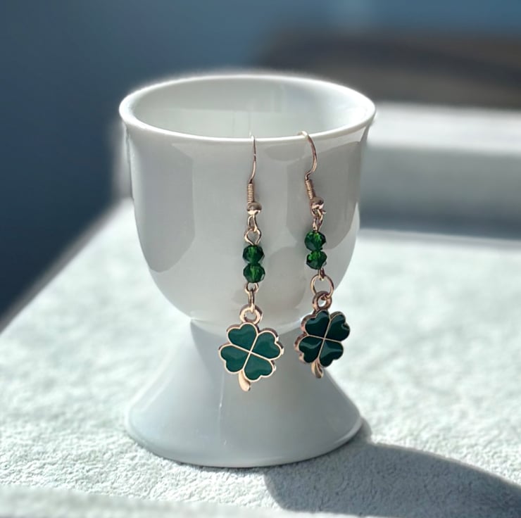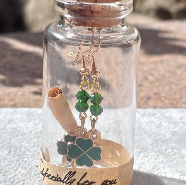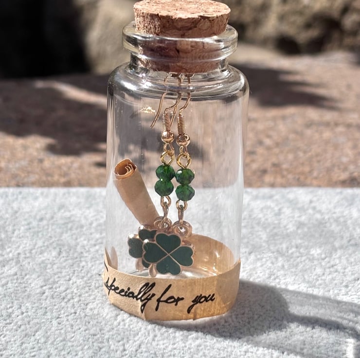 These handmade shamrock and crystal earrings are placed in a small glass bottle, Each pair includes gold plated sterling silver hooks for a high-quality, comfortable finish. Inside every tiny bottle is a hidden scroll, allowing you to write your own personal message, making these earrings a meaningful keepsake or gift. Perfect as Irish jewellery, a St. Patrick's Day accessory, or a unique handmade gift for her.