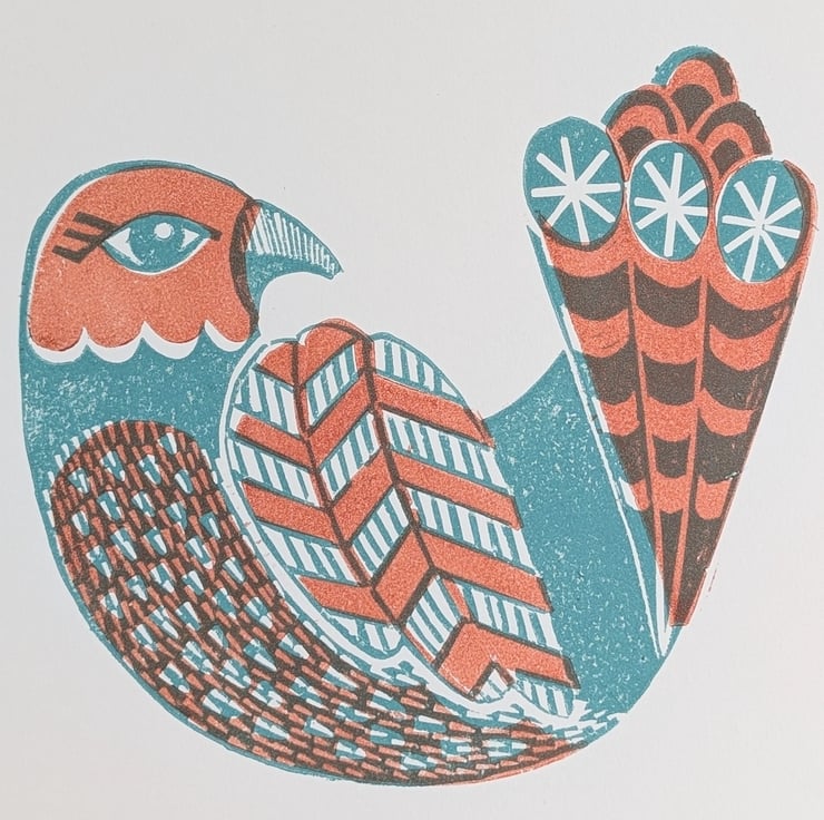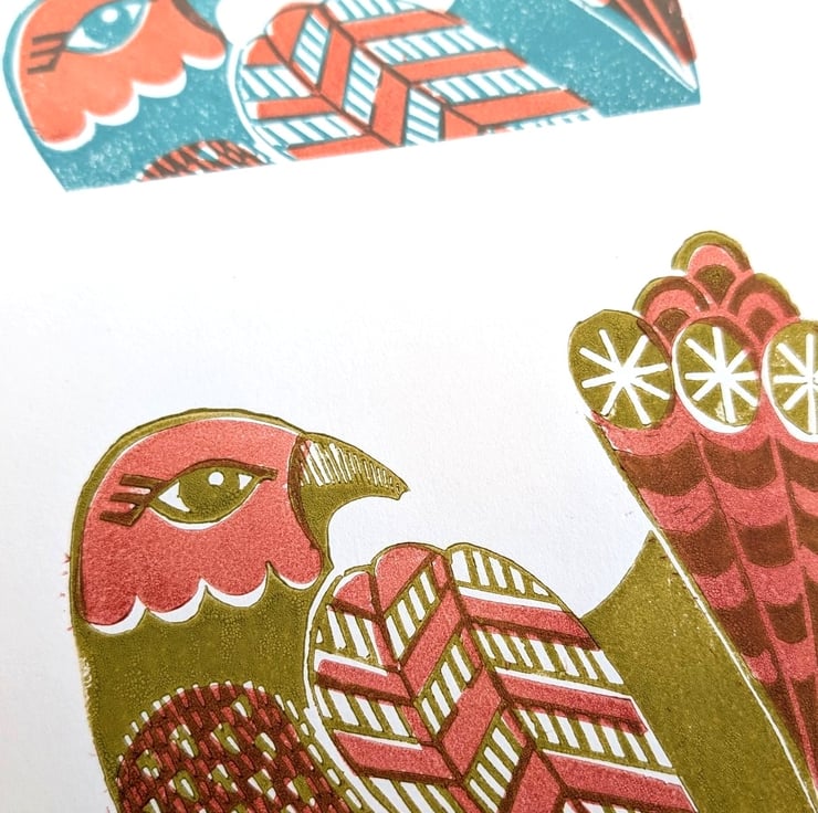 Hand carved from a traditional lino block from my own design and printed in a limited edition in 2 colourways.