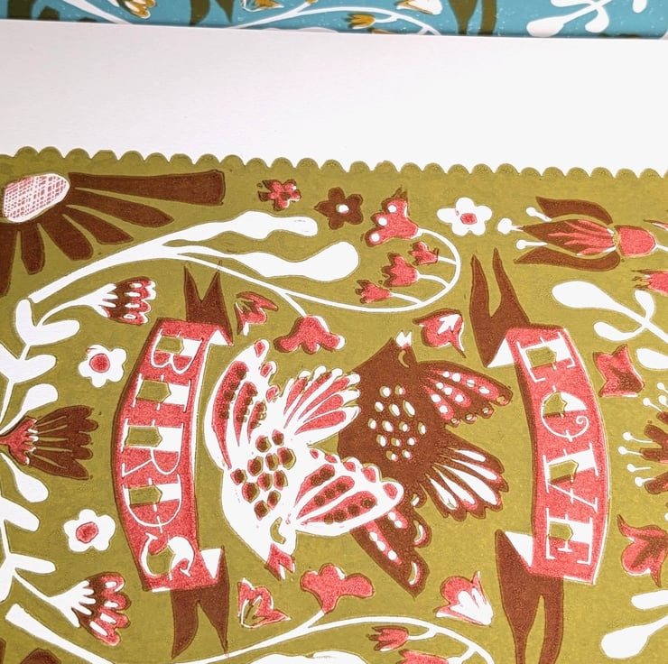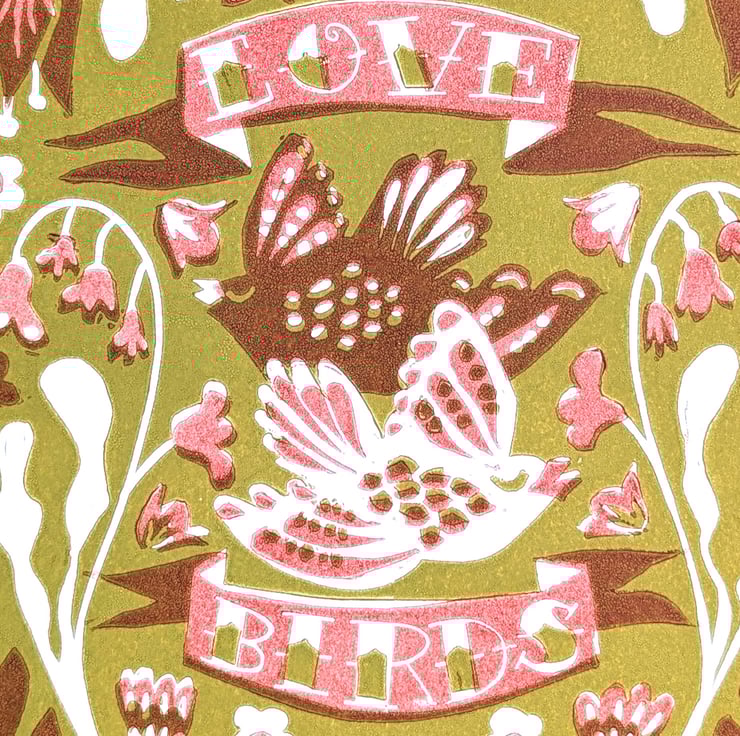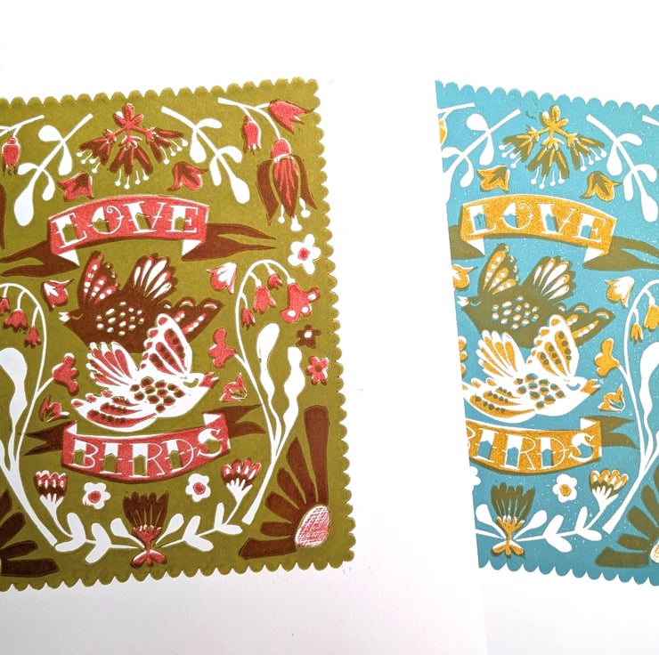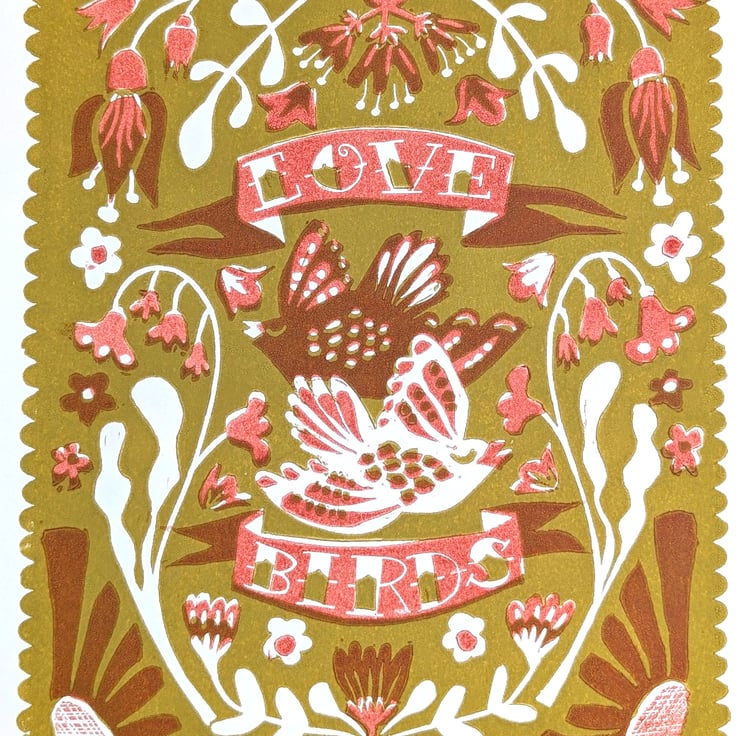 A gorgeous A3 print of my own design showing two little love birds fluttering around a meadow full of wild flowers. Handprinted in 2 beautiful colourways. (See separate listings for alternative colours.)