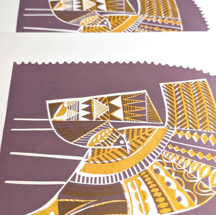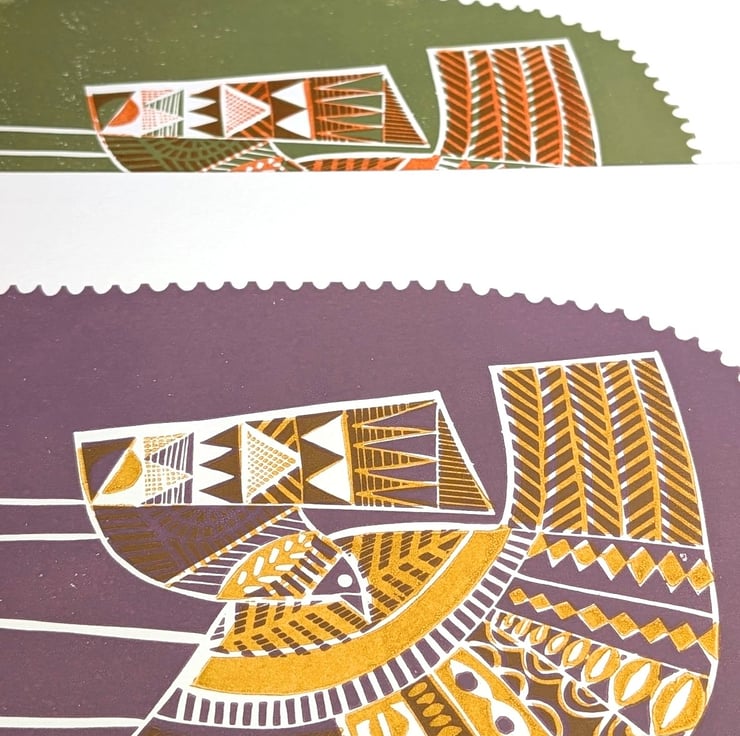 Hand carved from a traditional lino block from my own design and printed in a limited edition in 2 colourways.