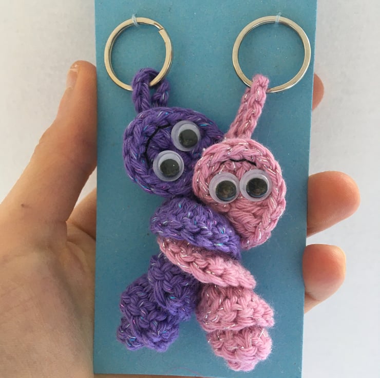 They are crochet and have googly eyes and a smiley face. Each one is attached to a keyring.