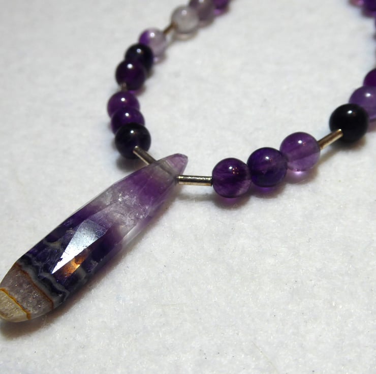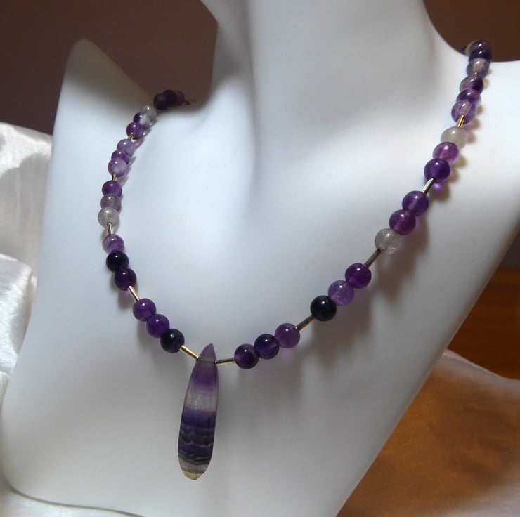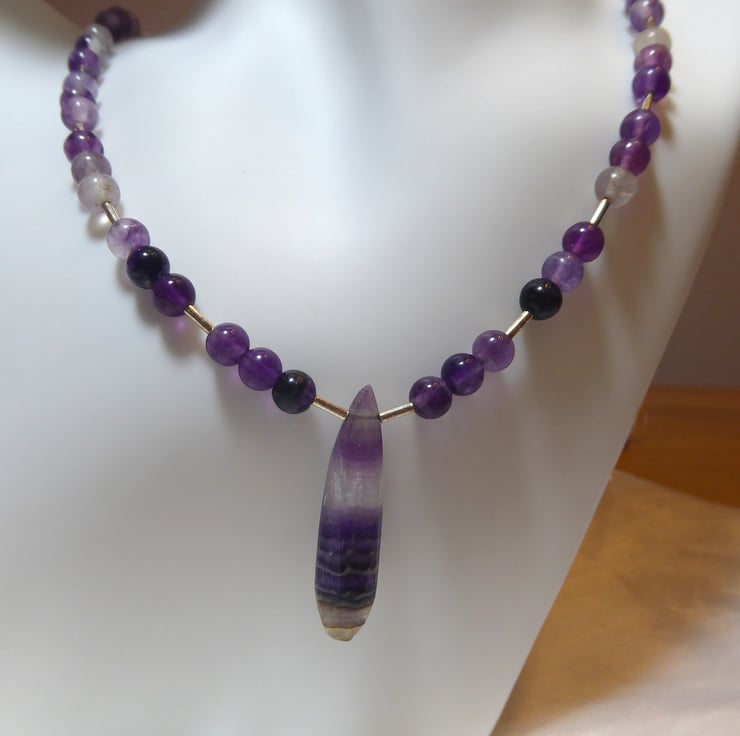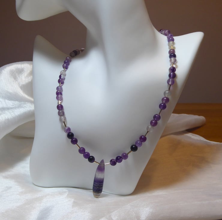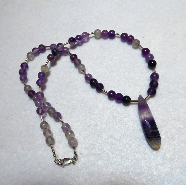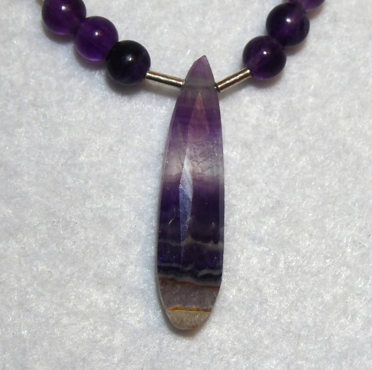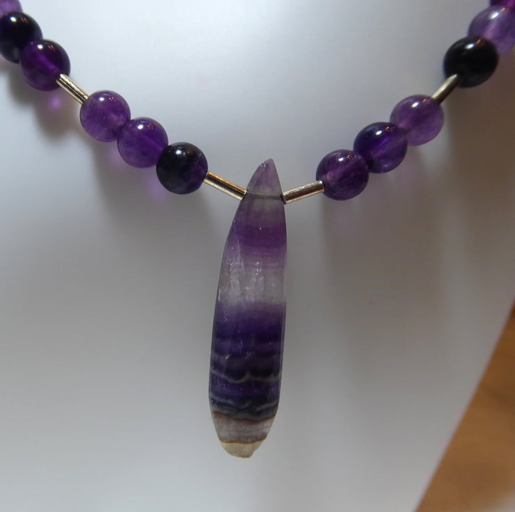 The necklace comprises 6mm round purple fluorite beads with sterling silver accents and features a long, narrow, faceted fluorite gemstone with bands of colour.