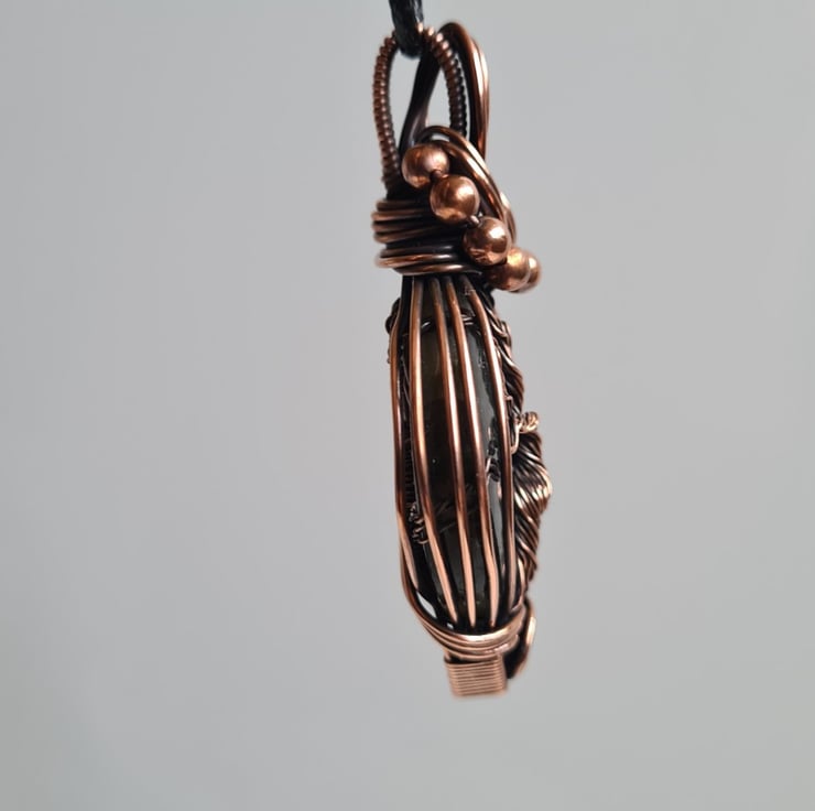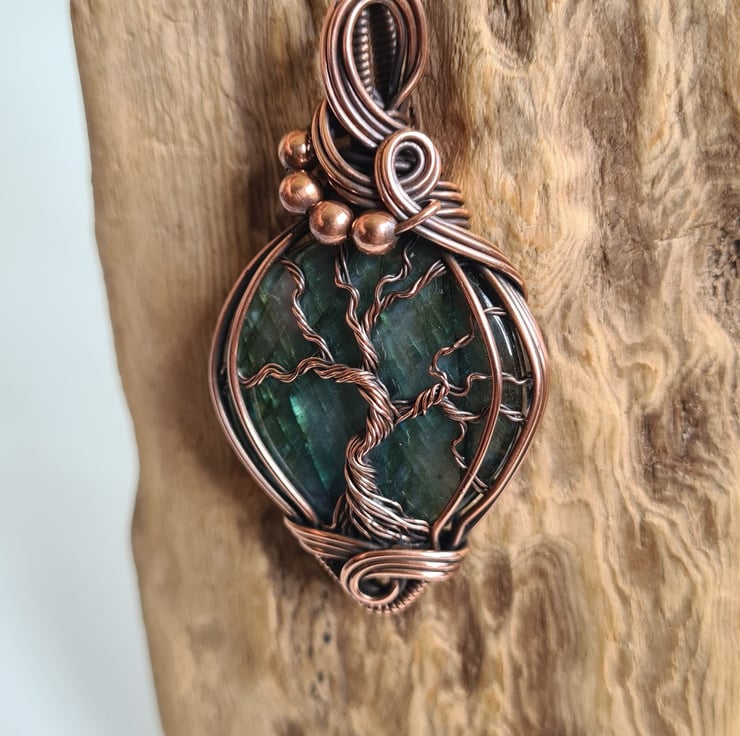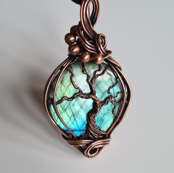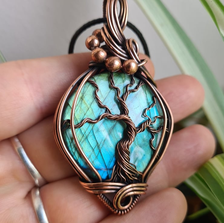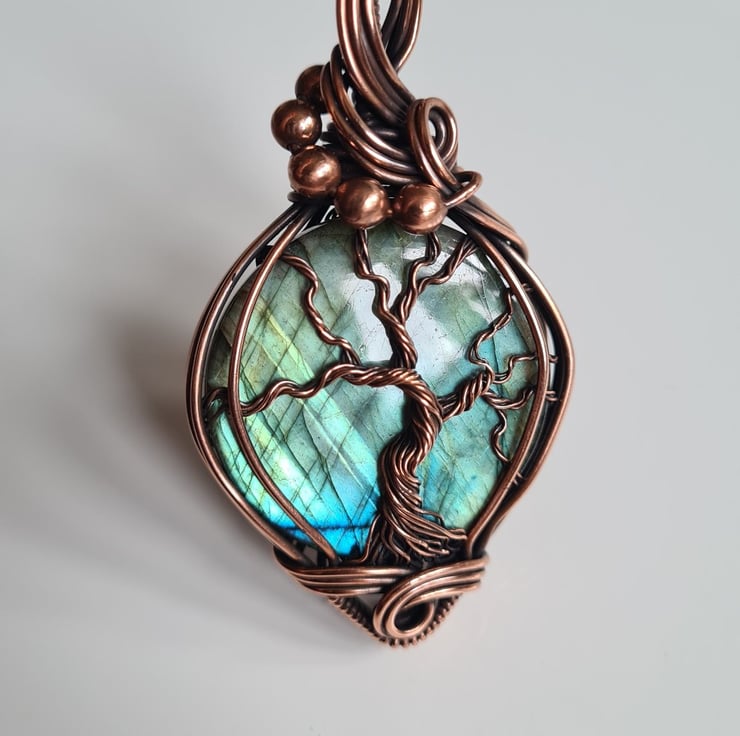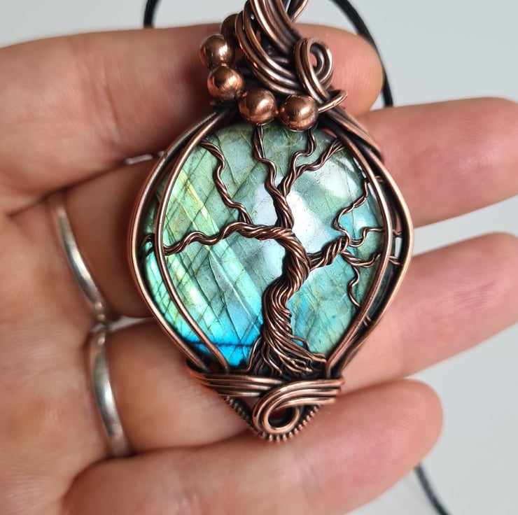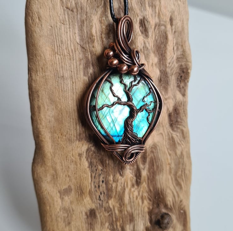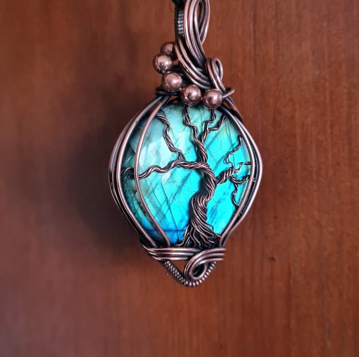 I have created this large, beautiful and very unique Tree of Life statement pendant using this beautiful Natural Labradorite crystal, which I have wrapped with copper featuring this gorgeous copper tree of life to the front.