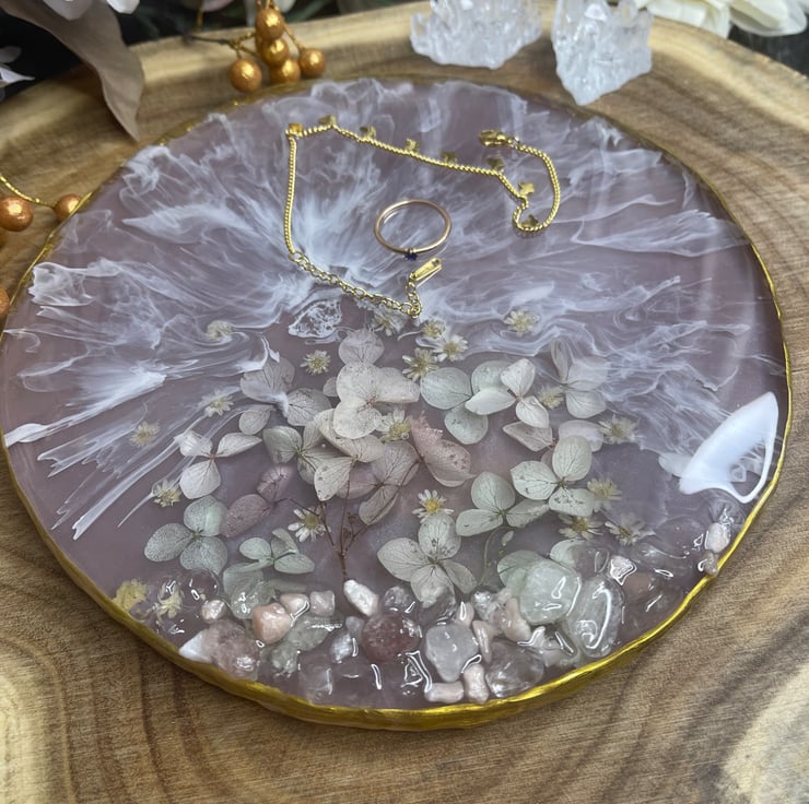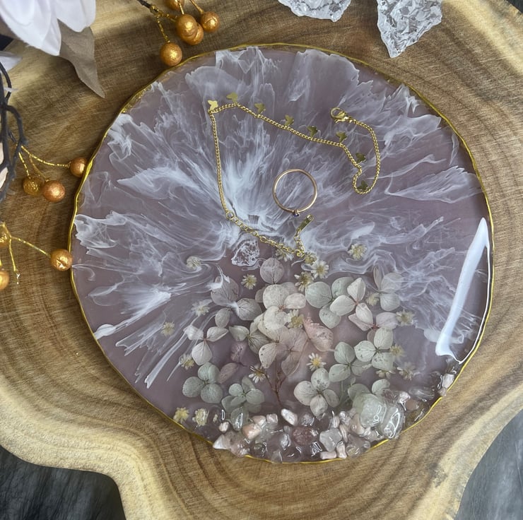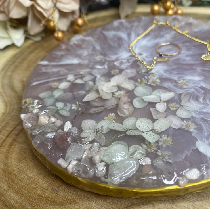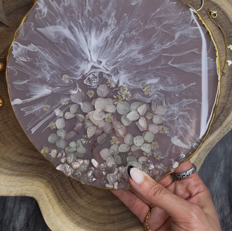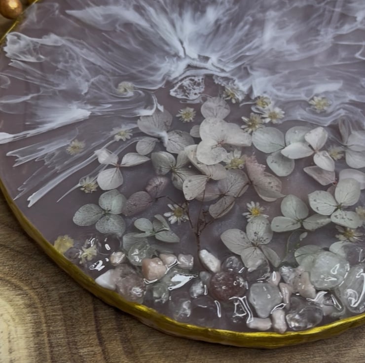 A handcrafted round resin coaster ( approx. 20cm , 400g) featuring delicate blush pink dried flowers, soft white waves details, and natural decorative stones. Finished with a refined gold rim for a luxurious touch.
