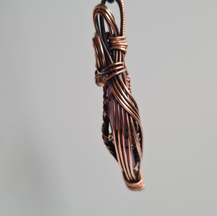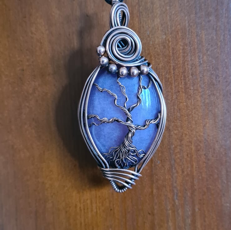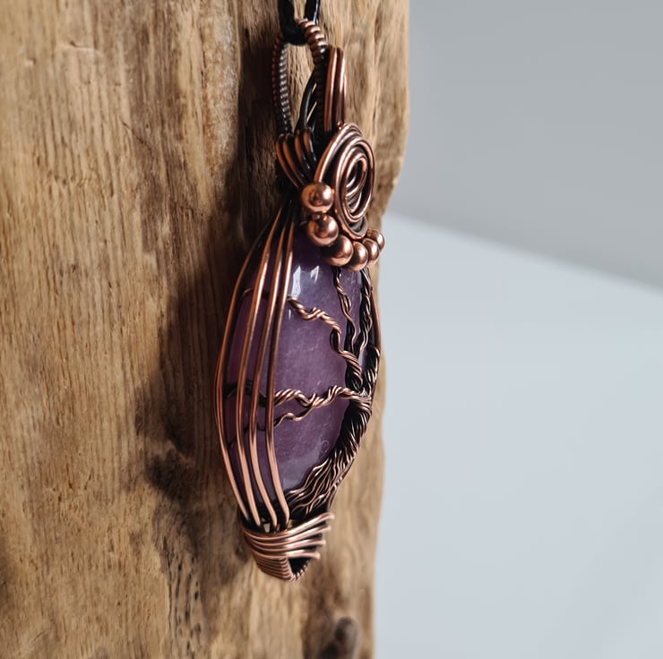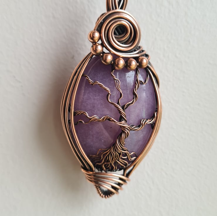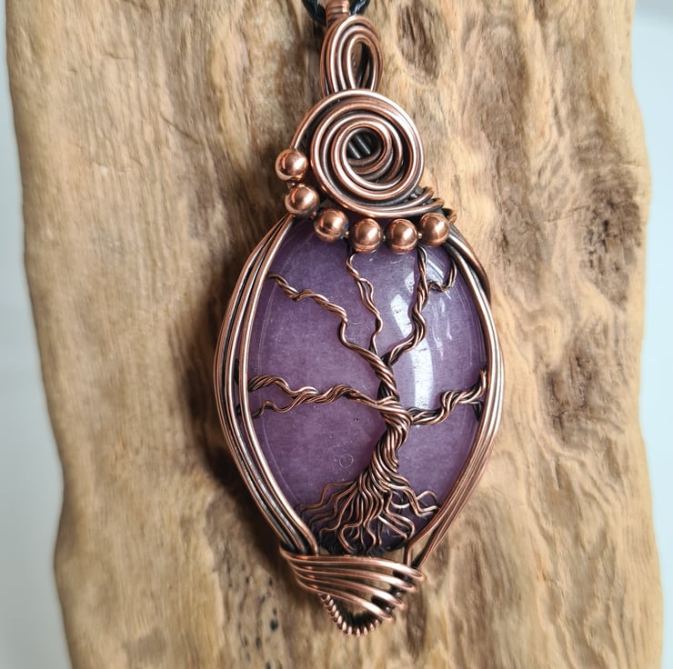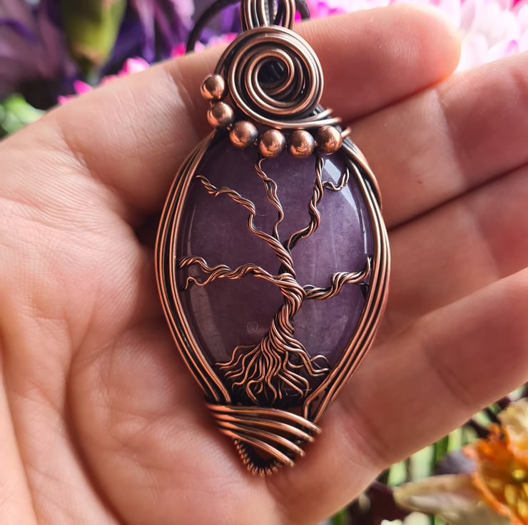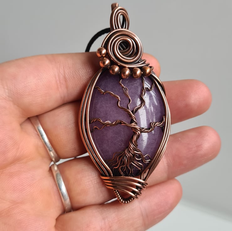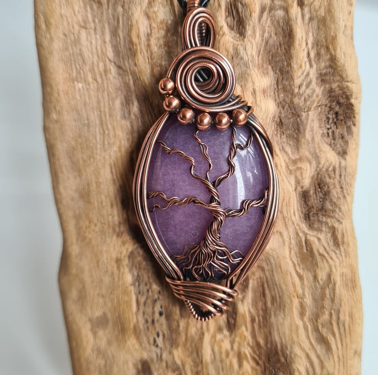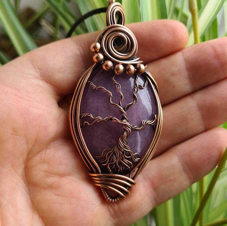 I have created this large, beautiful and very unique Tree of Life statement pendant using this beautiful purple dyed Gypsum/Spar stone, which I have wrapped with copper featuring this gorgeous copper tree of life to the front.