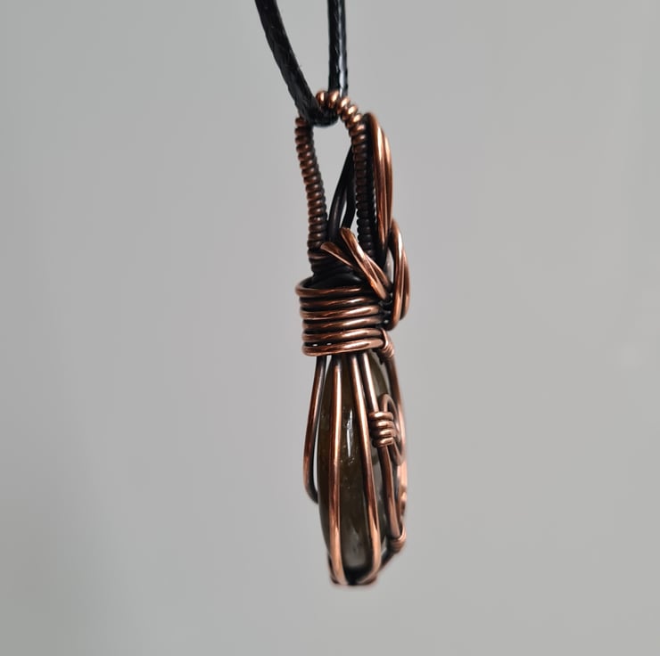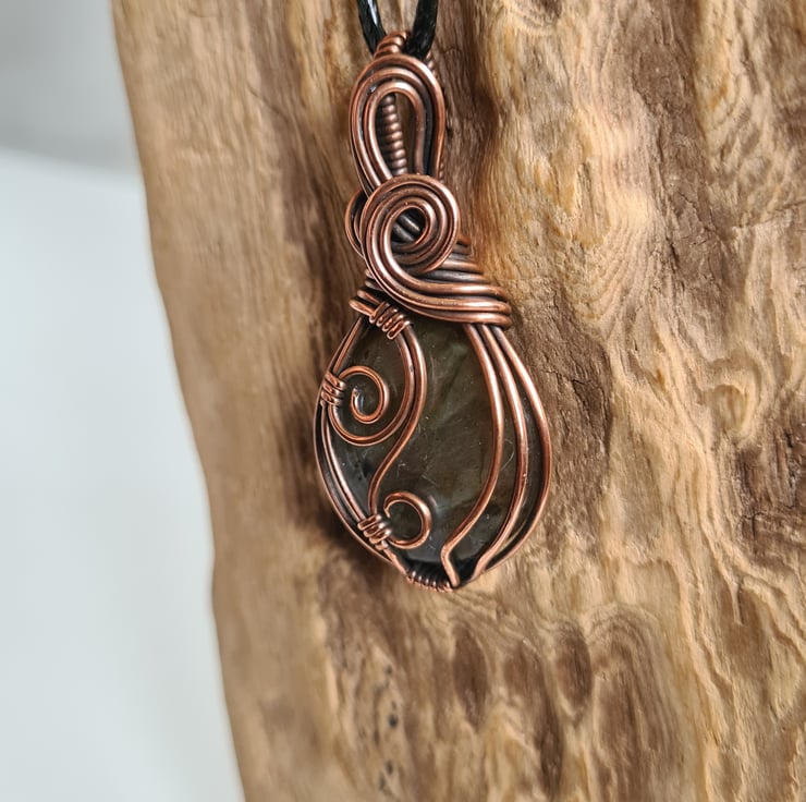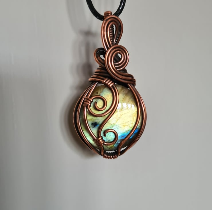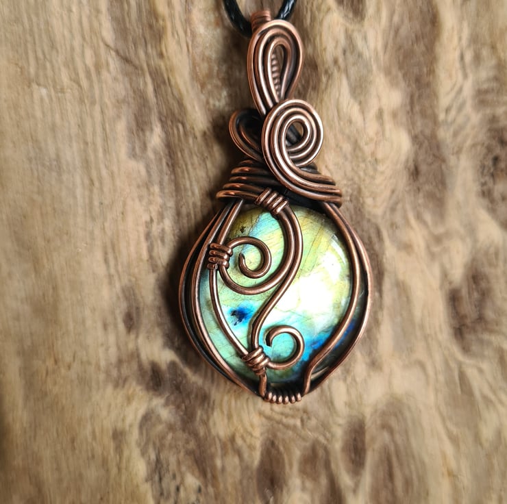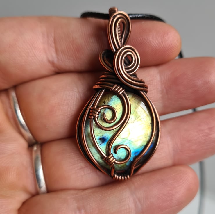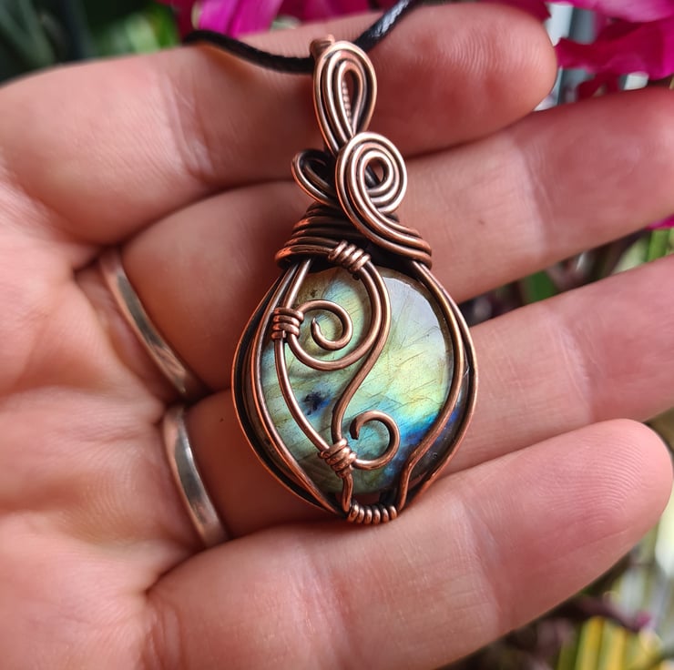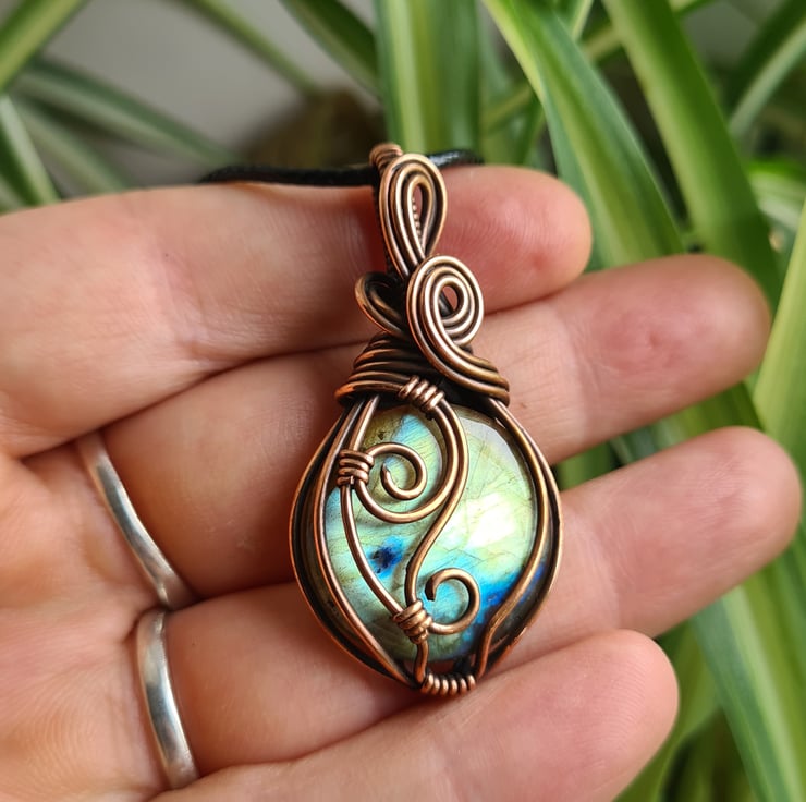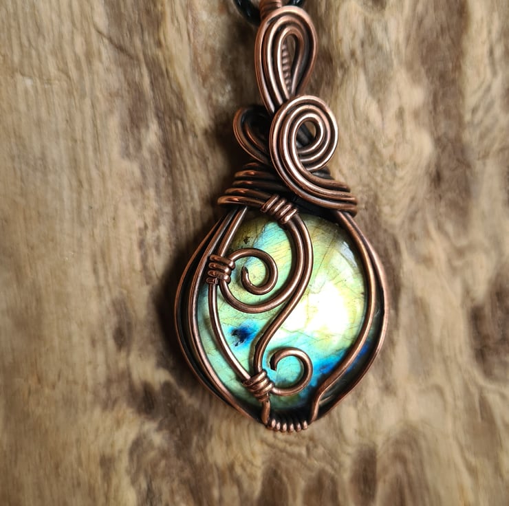 I have taken this gorgeous Natural Multicoloured Labradorite crystal and I have wrapped it in copper which I have then antiqued, to create this lovely elegant design. This stone is such a beautiful mix of serene green, gold and blue and looks perfect teamed with the copper.