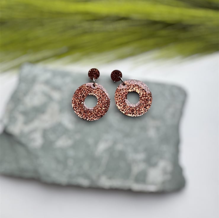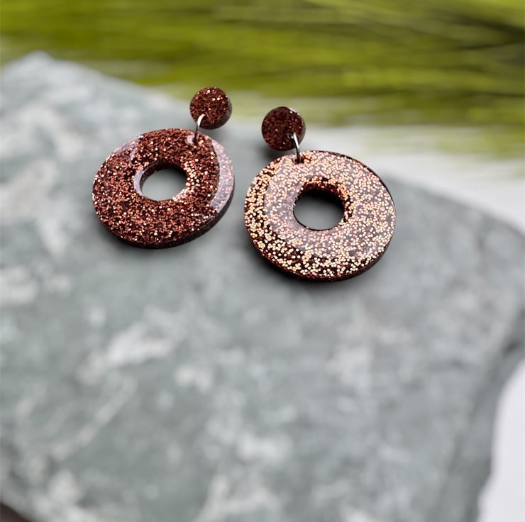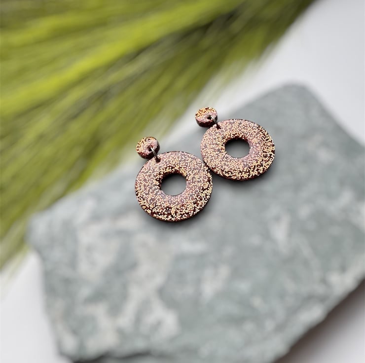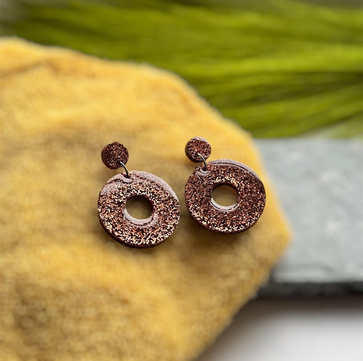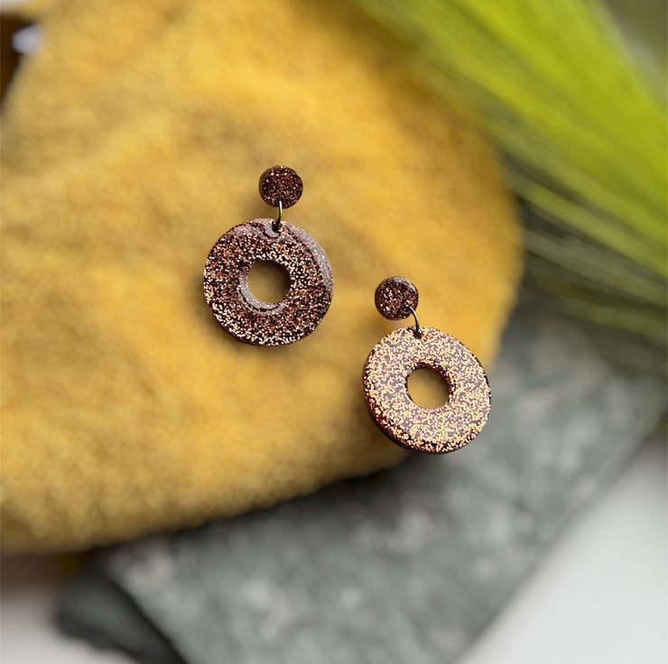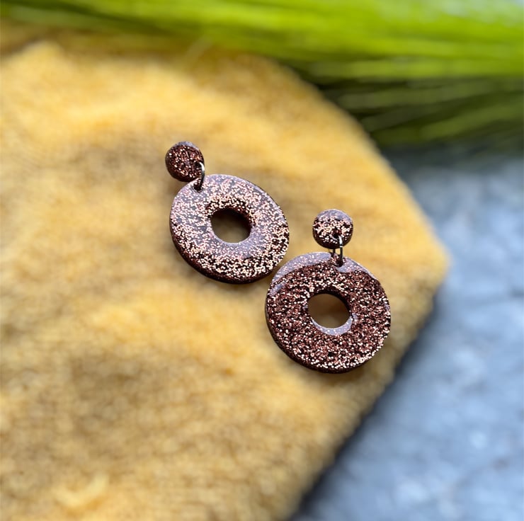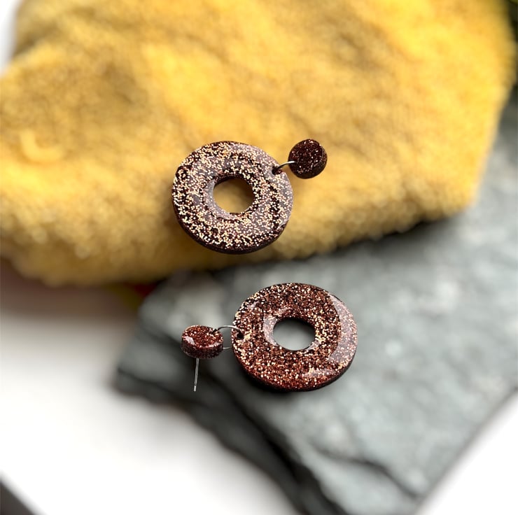 Bronze glitter circle hoop earrings with a connecting small circle stud.