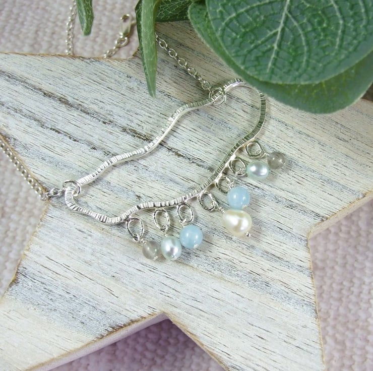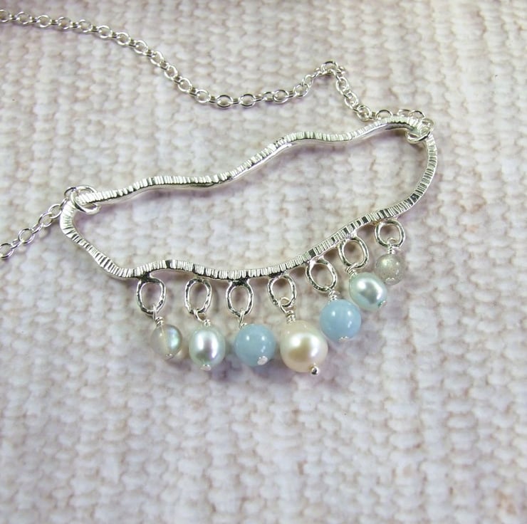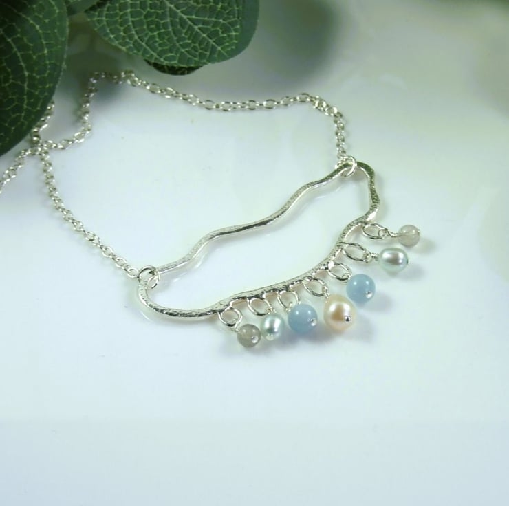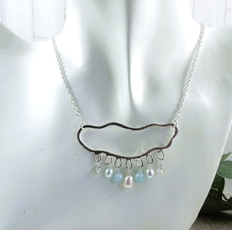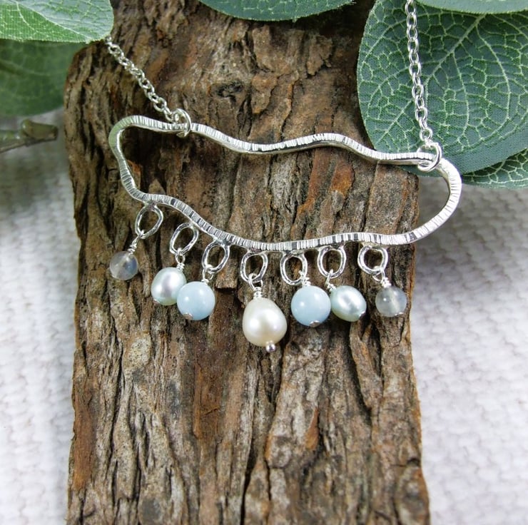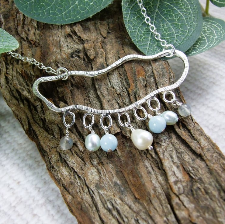 Sterling Silver rain cloud necklace with pearl, aquamarine and labradorite gemstone raindrops. Suspended from an 18 inch sterling silver chain.