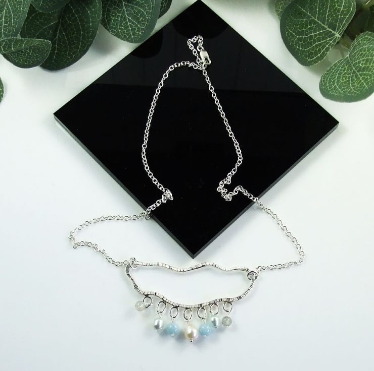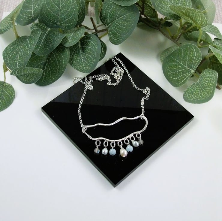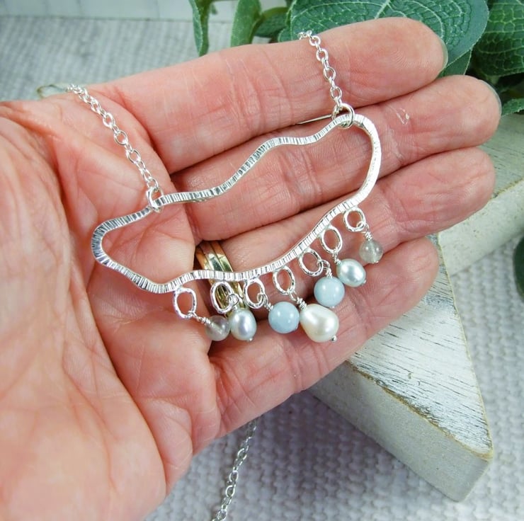 I created the rain cloud shape using 2mm square recycled silver wire. Shaped by hand into an organic cloud shape. I then added 7 small circles to hold the raindrops and soldered 9 inches chain either side of the cloud. The raindrops are a cream teardrop pearl at the centre, then two each of 6mm aquamarine, blue pearls and 4mm labradorite beads all securely wire wrapped in place.