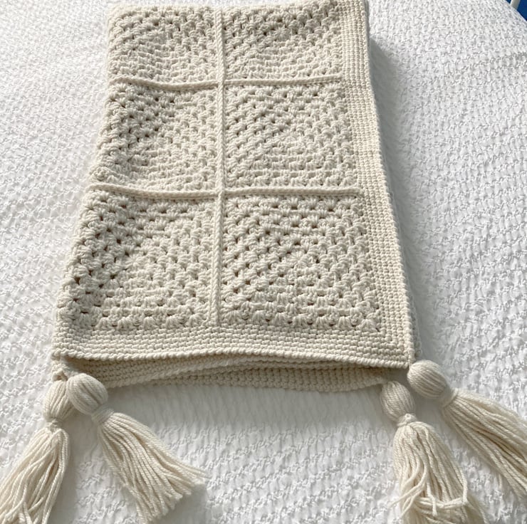 It is made up of joined squares, a simple border has been added and finished off with a turned edge, there is a tassel at each corner and it measure 122cms (48ins) square
