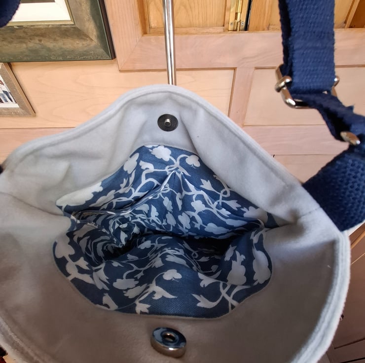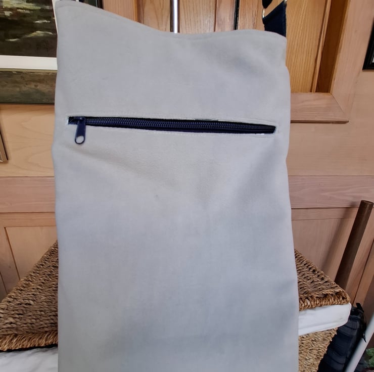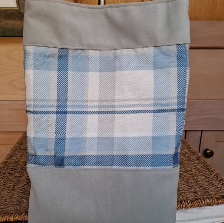 Smart crossbody bag in light grey velvet and blue tartan, with zipped outer pocket on the reverse. Lined in printed linen, with inside pockets, magnetic fastener and adjustable cotton webbing strap.