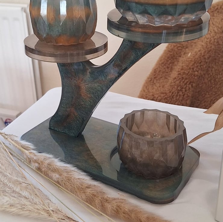 Add a striking botanical focal point to your home with this handcrafted resin display set from Neurobloom. Featuring a unique tree branch inspired silhouette, this stand is finished in a luxurious forest green with swirling metallic copper accents.