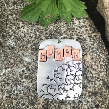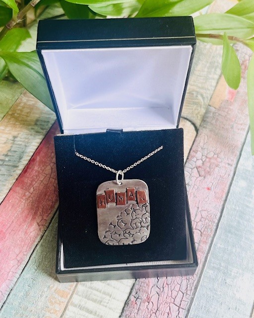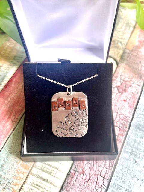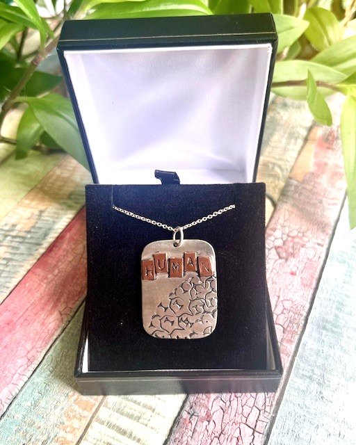 This is a beautiful handmade solid Sterling Silver 925 pendant, with 'Human' stamped by hand on individual copper pieces which have been soldered above a stamped shape of the world. This unique piece of recycled silver jewellery hangs on an 18" Sterling Silver 925 trace chain. It makes a meaningful gift for someone who loves handmade and unique silver jewellery, or who cares about the planet. It carries a full conventional Hallmark.