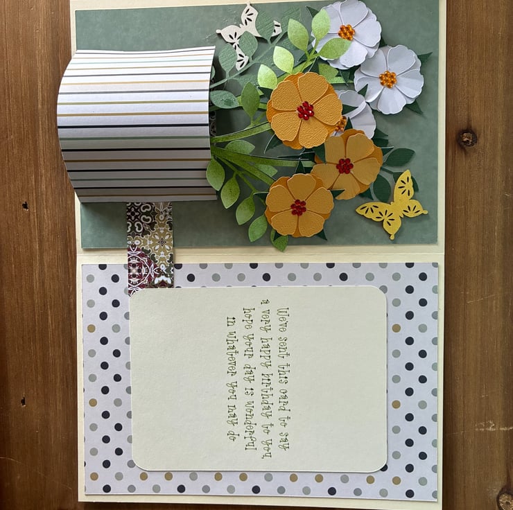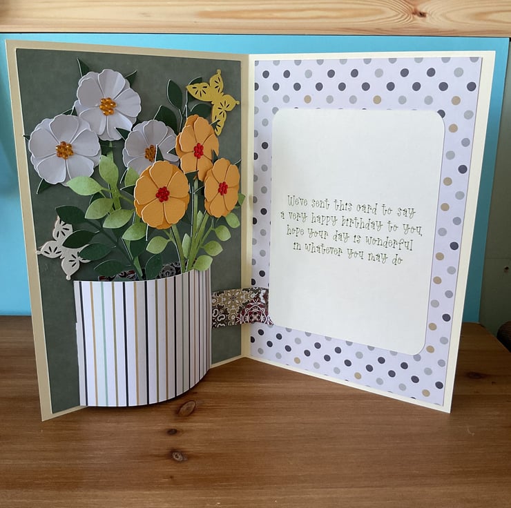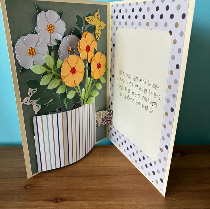 This pop up card is a vase of flowers with a birthday message. The birthday message can be changed for a message of your choice.