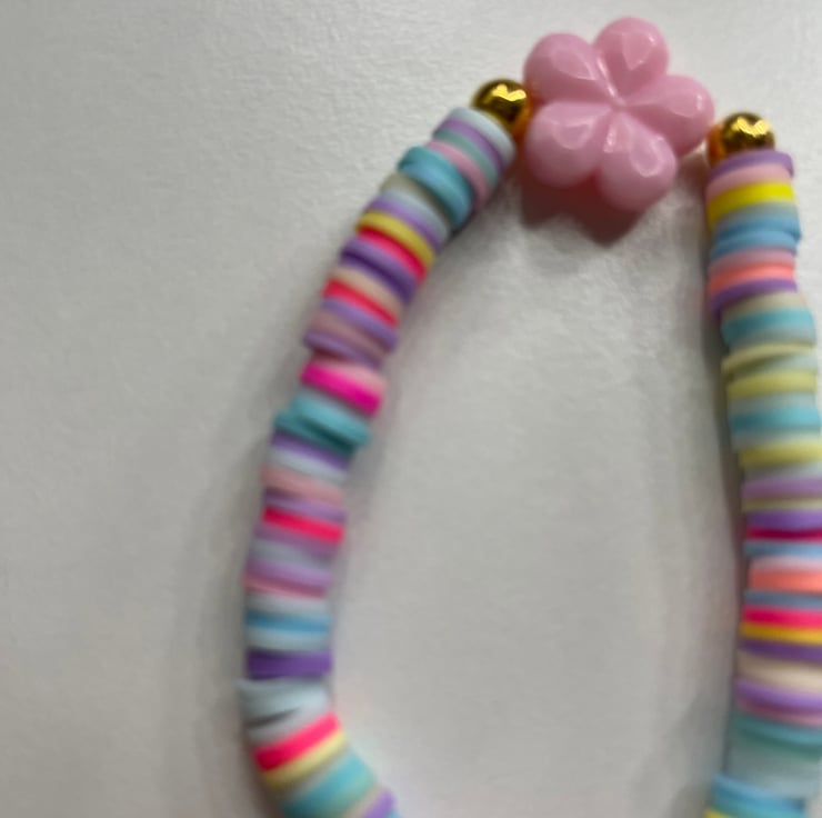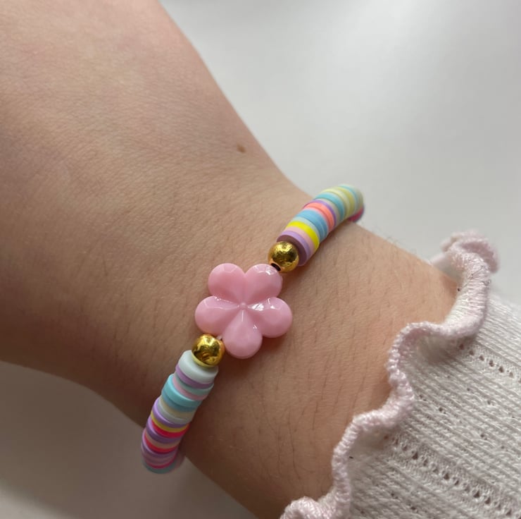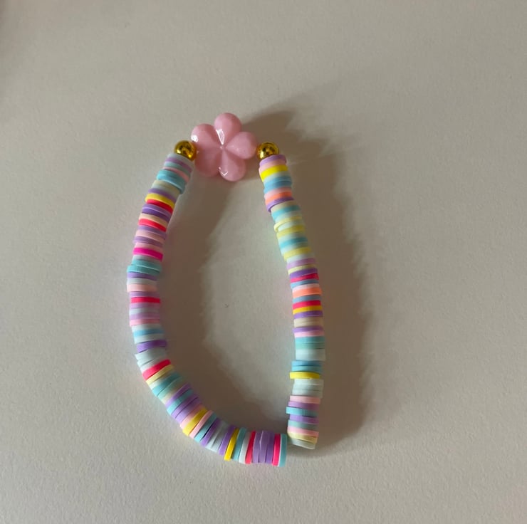 A clay bead bracelet with a flower charm and gold to border the flower. It has spring colours and it is perfect for an occasion where you would want to buy a small gift for your loved ones or even to add a pop of colour to any outfit!!!