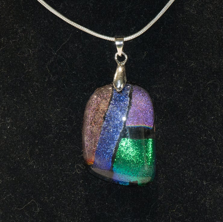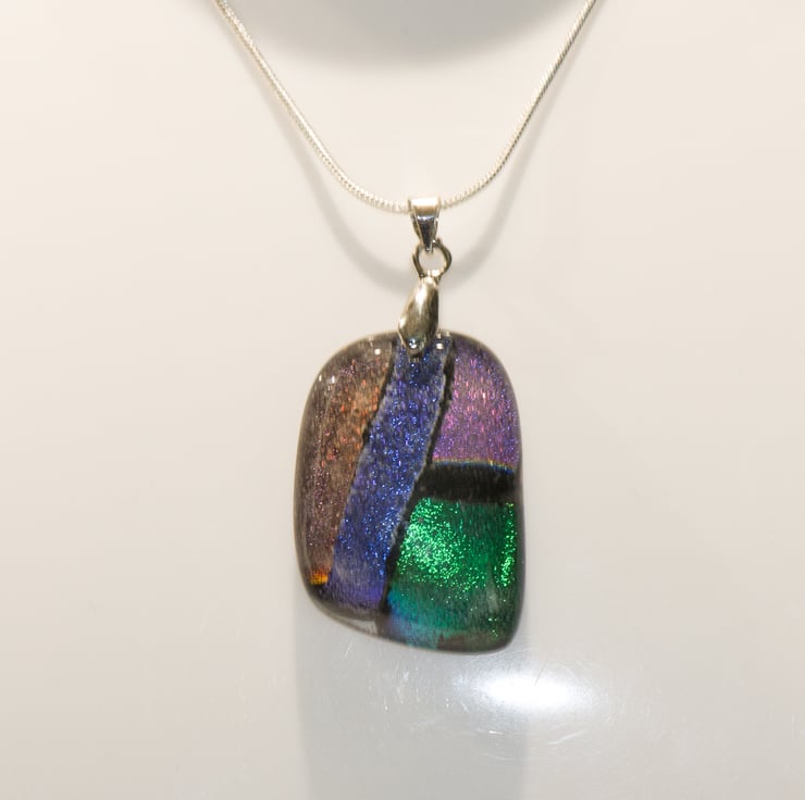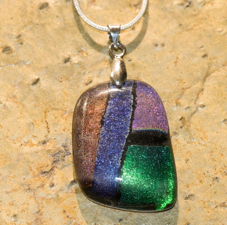 Add a pop of vibrant colour to your wardrobe with this handcrafted dichroic glass pendant. This piece features a unique vertical patchwork design, blending shimmering shades of emerald green, royal purple, sapphire blue, and warm copper-bronze. The glass captures and reflects the light beautifully, shifting in tone as you move.