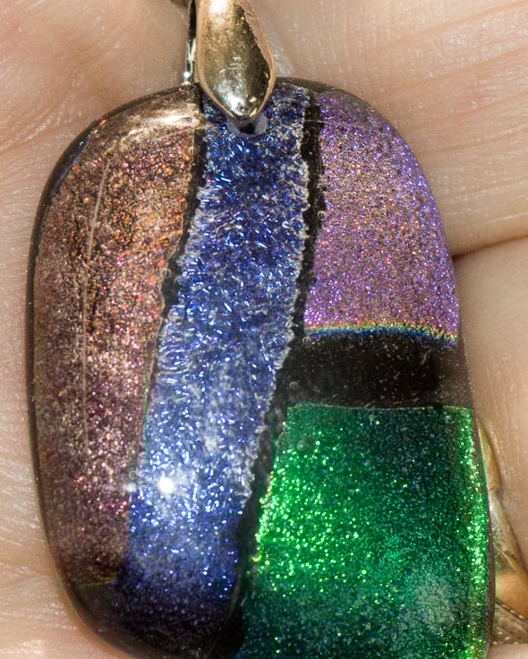 Our Dichroic Glass comes in random shapes of random colours - that's how we buy this expensive glass economically.