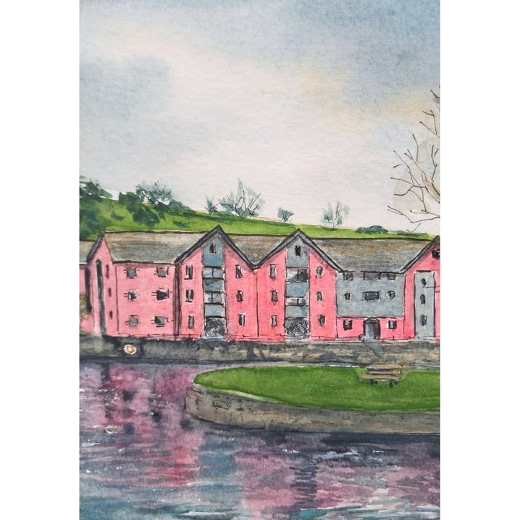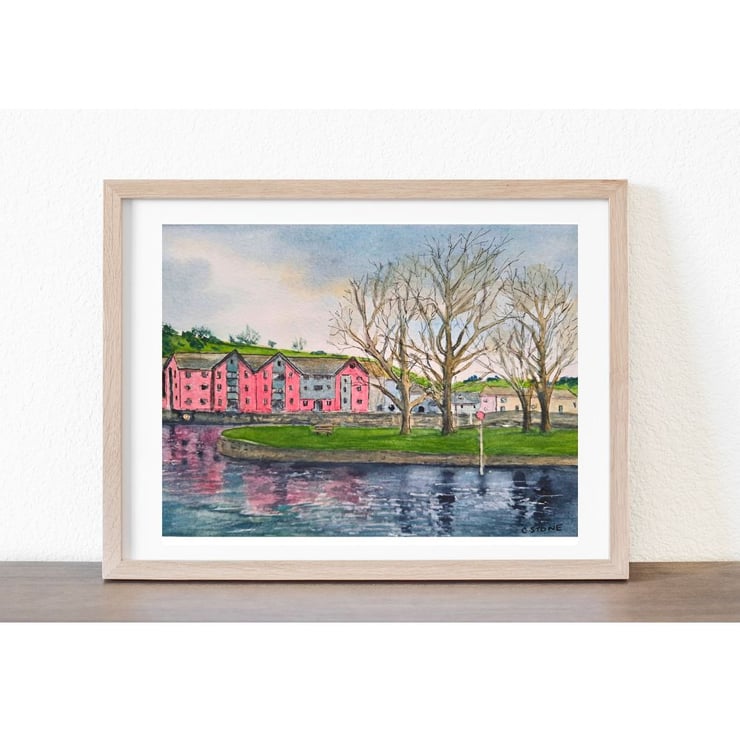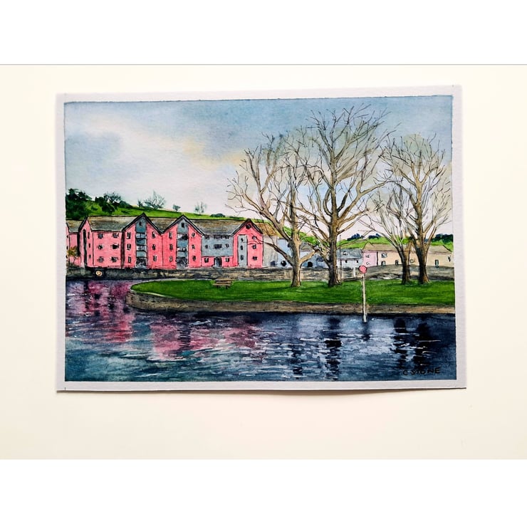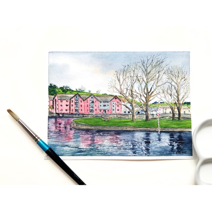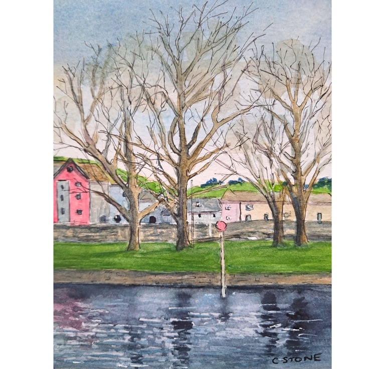 The beautiful River Dart in the charming Devon town of Totnes, is the scene for this little watercolour and ink painting, based on my own photographs and sketches. The view was taken from the Steamer Quay area, looking west towards the town centre.